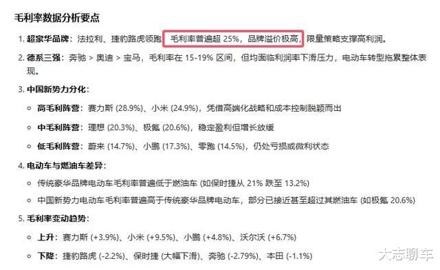 这里,我们牵扯到一件事情,就是车企的买车方式,大多数都是中高端车收割利润,低端车负责走量,我们从网上找到的资料就能看出来的,超豪华品牌里面的法拉利和捷豹路虎等等,他们的毛利率都达到了25%,相当于一辆100万的车,他们就赚走25万,说到底,他们只是在车上用了75万的用料,其他都是车辆的利润。