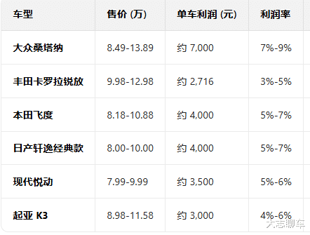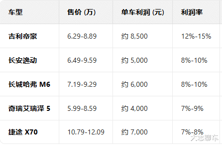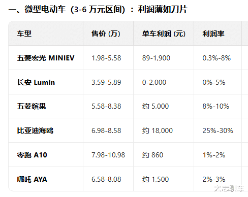 而反过来,我们再看低端车的毛利率,我把各大车企的低端车都整理了一下,不管是微型电动车、国内自主品牌的小型燃油车,还有合资品牌的车型,你会发现一件事情,就是低端车普遍的毛利率都不高,而之所以低端车会这样,反而是因为低端车大多数都是属于走量车,走量就是用来给车企堆销量数字的,这时候,品控反而更好。