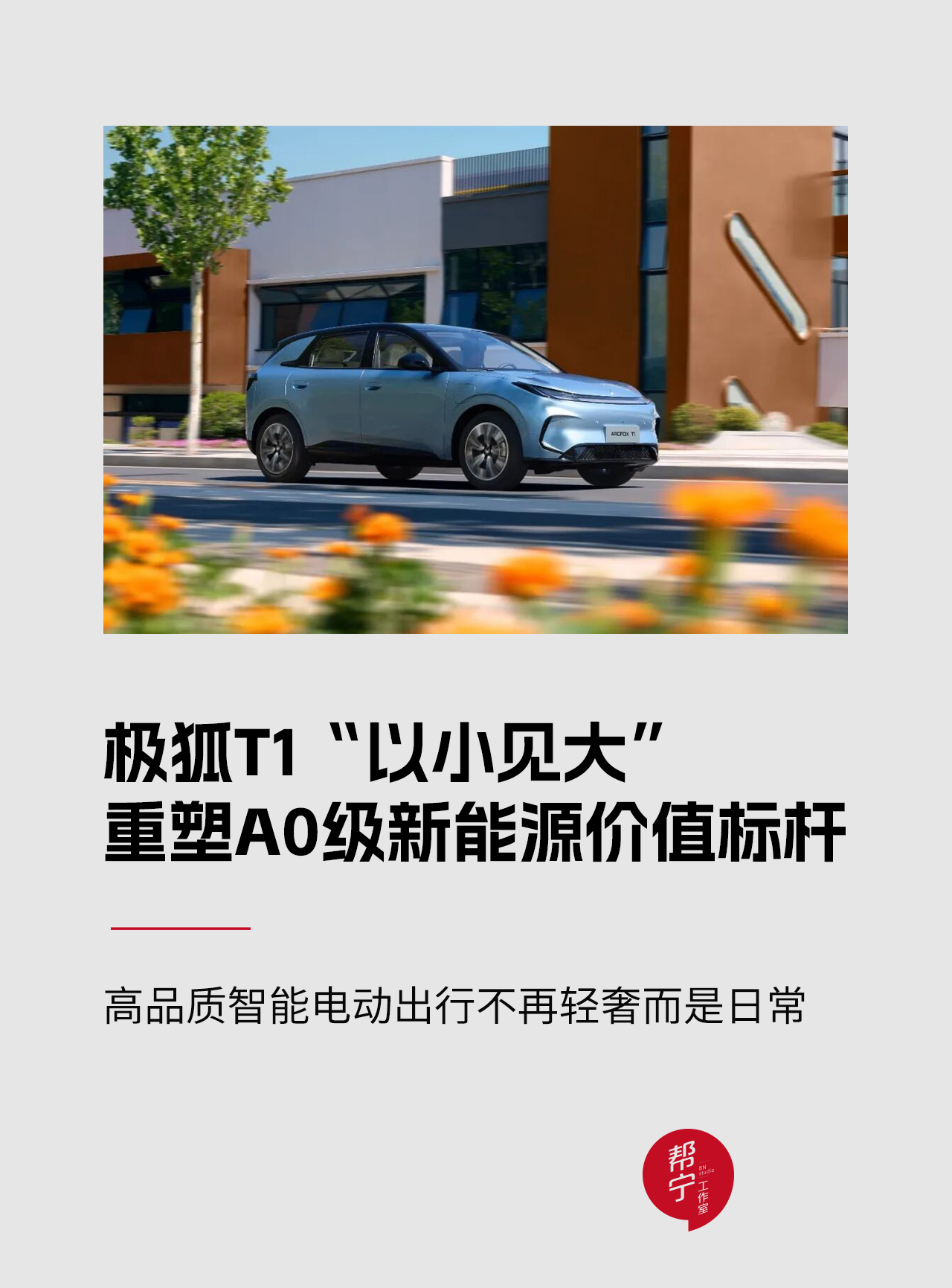极狐T1作为家庭精品纯电新标杆,以大容量、随心开、好精致、极安全的越级价值,真正让用户花小钱、买好车、办大事。