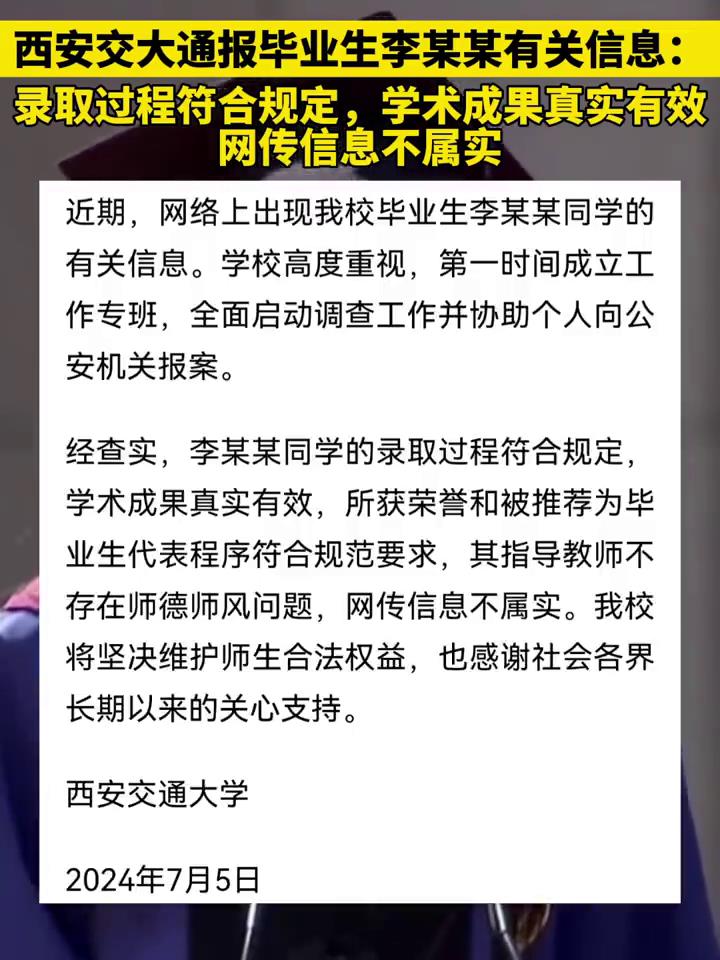 面对舆情风波,西安交通大学高度重视,迅速成立了工作专班,全面启动了调查工作。学校协助个人向公安机关报案,并积极配合公安机关的调查。经过深入调查,学校发布了情况通报,明确了事件的真相。通报指出,李某某的录取过程符合规定,学术成果真实有效。李某某在校期间积极参与科研工作,取得了多项学术成果,包括申请国家发明专利和发表国际会议论文等。这些成果均经过严格的审核和验证,真实有效。此外,李某某所获得的荣誉和被推荐为毕业生代表的程序也符合规范要求。