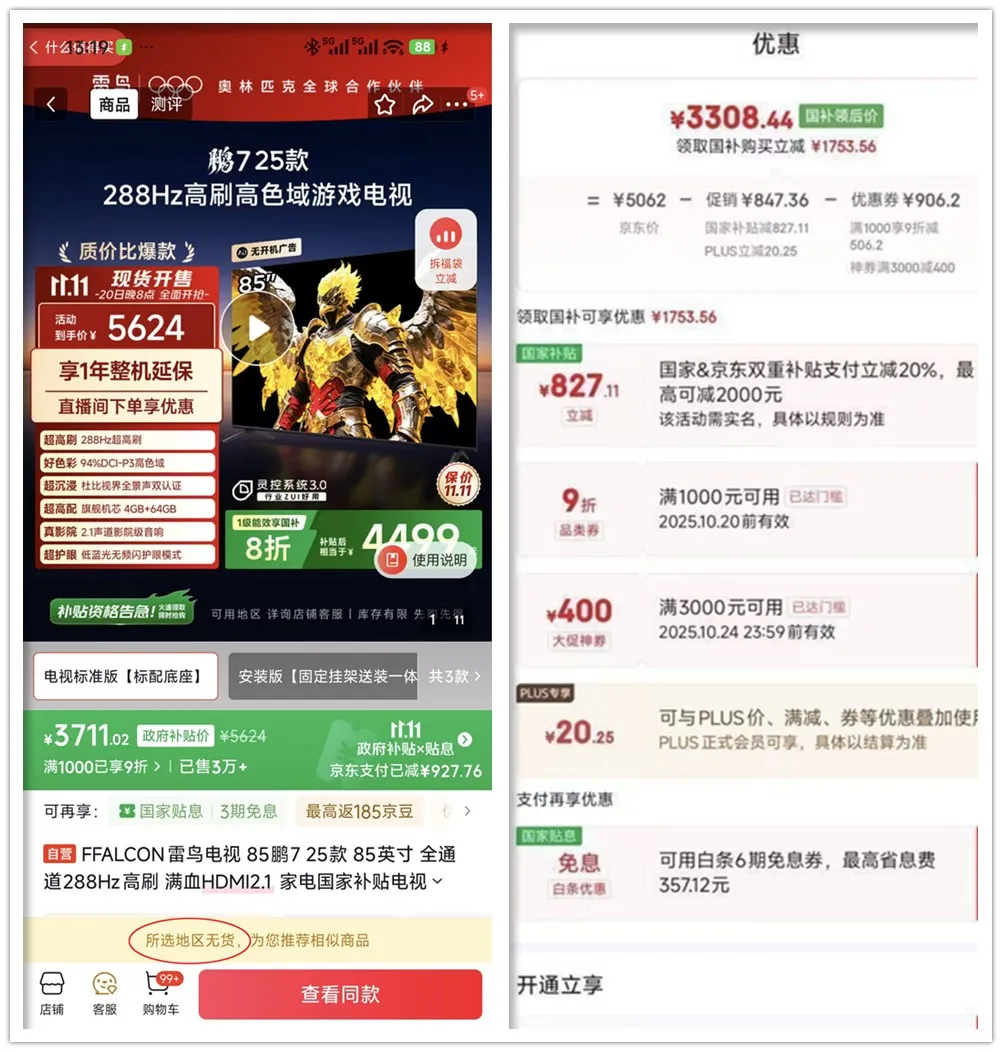 再结合用户晒单聊下产品,这是雷鸟的85英寸大电视,采用144Hz的4K高刷面板,主打一个开机无广告卖点,能实现秒开机。