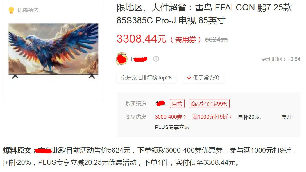 根据张大妈爆料,狗东原价5624元的雷鸟鹏7 2025款,通过国补与多重优惠后,实付低至3308.44元。这可不是鹏6,而是鹏7,虽然我印象中618更便宜,但在目前的时间节点,这个价格没毛病了。