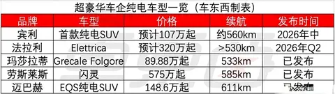 宾利的动作只是缩影,超豪华品牌早已集体入局。劳斯莱斯首款纯电车型闪灵上市即售罄,575万的高价挡不住富豪热情,甚至要拉黑倒卖订单的车主;玛莎拉蒂去年就推出Grecale Folgore纯电SUV,89.88万的定价抢跑中端豪华市场;连法拉利都官宣2026年春季发布纯电四门GT跑车Elettrica,四电机+122kWh电池的配置堪称性能猛兽。