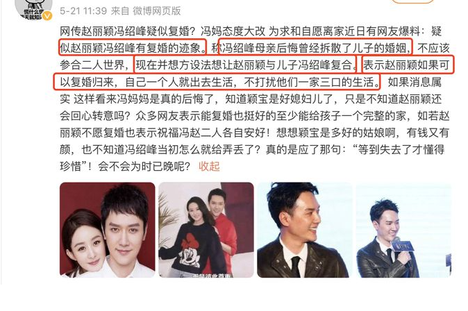 在五月二十一日的时候,有人爆出了两人可能已经复婚的消息,爆料的人说,是冯绍峰的母亲破坏了两人的婚姻,冯的母亲很后悔,一直在想办法让两人和好,如果两人复婚的话,她会自己一个人住,不会再影响两人的感情。