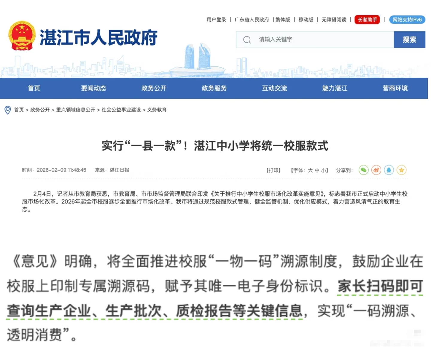 值得一提的是,该制度是湛江校服市场化改革的重要部分,同步推行“一县一款”统一校服款式(融入地域元素),“一物一码”就是给这些校服加上的“数字安全锁”。