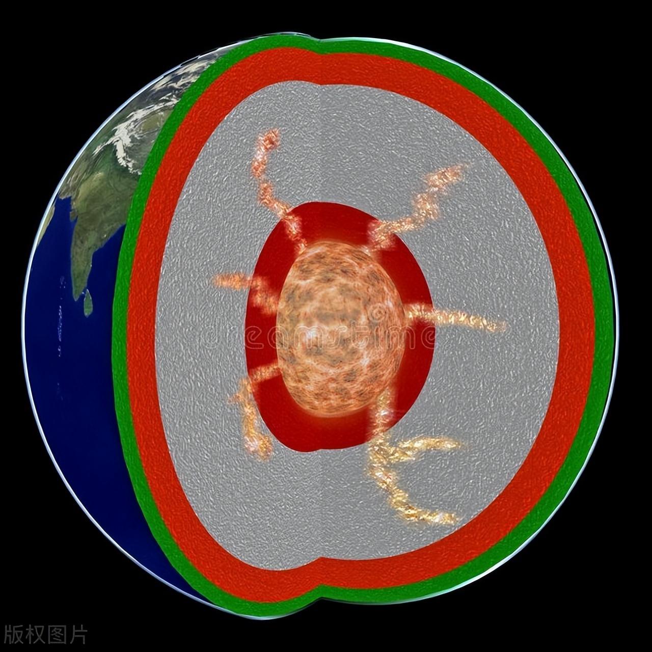 地壳的下面就是地幔,地幔的总厚度达到了2800公里,上地幔是由橄榄石、辉石还有其他矿物质组成,下地幔是由硅、镁、氧等物质组成,在地幔下面就是地核,地核的温度非常高,地心的温度比太阳表面的温度还要高,大约是6000摄氏度左右,科学家认为,地核的主要组成物质就是铁和其它的金属物质,其中外地核中的金属处于液态,内地核中的金属处于固态,看到这里,可能很多朋友会产生一个疑问,就是为什么内地核的温度要比外地核的温度高,而内地核的金属是固态的?科学家认为,由于内地核处于地球的中心位置,所以它需要承受300多万个大气压强,在如此高的压强之下,物质只能够以固态的形式存在。