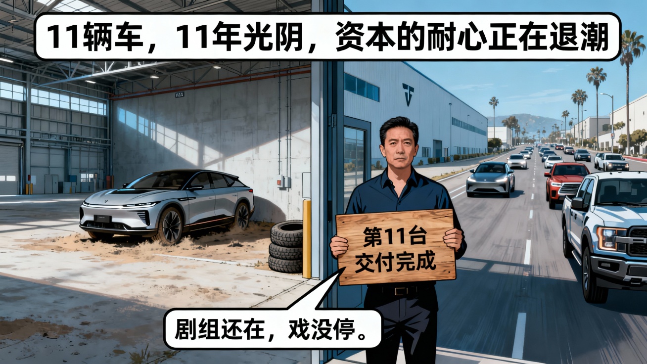 200亿市值,跌到几乎不剩什么。交付了11辆车。这两个数字并排放在一起,你甚至都感觉不到商业传奇失败的“悲壮感”,只剩下一种近乎荒诞的“破碎感”。这出戏演了太久,久到观众(和资本)都已经疲惫了。