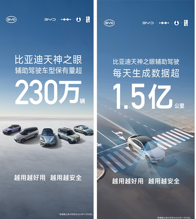 数据显示,截至2025年11月底,比亚迪搭载“天神之眼”驾驶辅助系统的车型累计销量已突破230万辆,持续蝉联中国辅助驾驶车型销量及系统装车量榜首。这标志着比亚迪推动的“全民智驾”战略已取得显著成效,智能驾驶正从高端配置加速向主流市场普及。