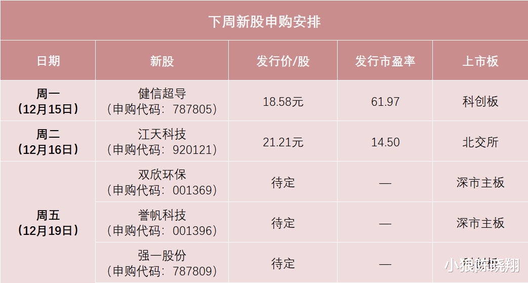 附1:年底大福利第一,在“个人所得税”官方APP,确认2026年度的专项附加扣除。没变化的,直接一键带入去年信息。12月千万别忘记做,不然明年会多交税。第二,个人所得税率在10%及以上的朋友,赶紧买个人养老金,可以抵扣个税。每年1.2万元的额度,短期有抵税收益,长期还给退休之后提供又一份保障。附2:下周打新5只股票,2只主板,2只科创板,1只北交所。双欣环保,在今年的深市主板新股中,发行股票数量排名第一,中签率可能较高。