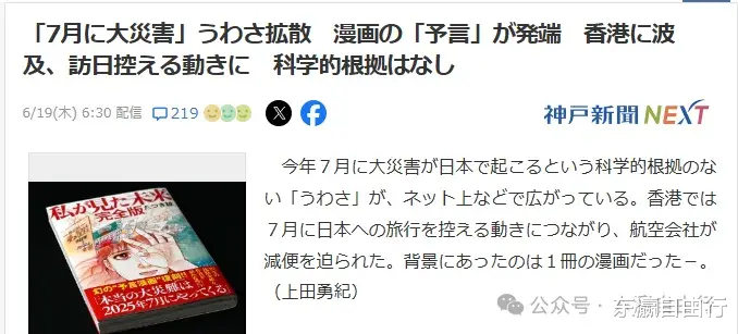 日媒称,相比其他国家和地区来看,来自中国香港的游客就减少了11.2%,为19万余人。因为香港有媒体称日本7月将有一次大地震,香港航空公司由此减少了飞往日本各地的航班,部分航班甚至停航,导致前往日本旅游的游客减少。据鹿儿岛县相关人士称,鹿儿岛机场7、8、9月全部停飞。运营该航班的香港航空公司解释称:“随着将发生地震的消息传开,旅客正在减少”。