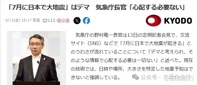 不过,有日本网友对气象厅长官野村龙一的观点不认同。这网友表示:之所以不认同气象厅长官的观点,是因为他强调现在的技术还不能预报何时发生地震。既然预报不了,那为何他就断定7月地震不会发生?7月5日会不会发生什么另当别论,被认为是谣言的事情实际上也有。所谓宁可信其有不可信其无,也是人之常情。
