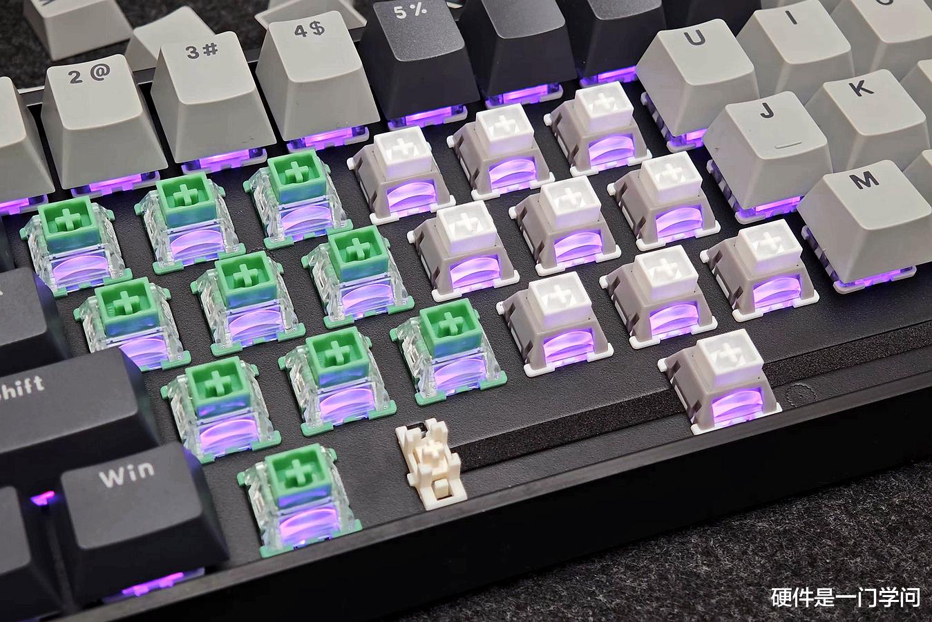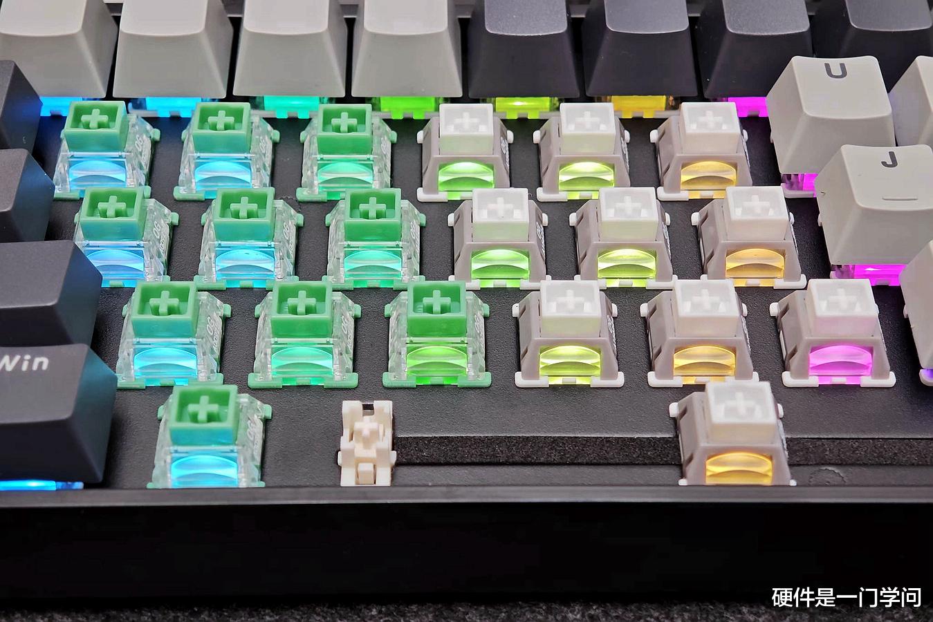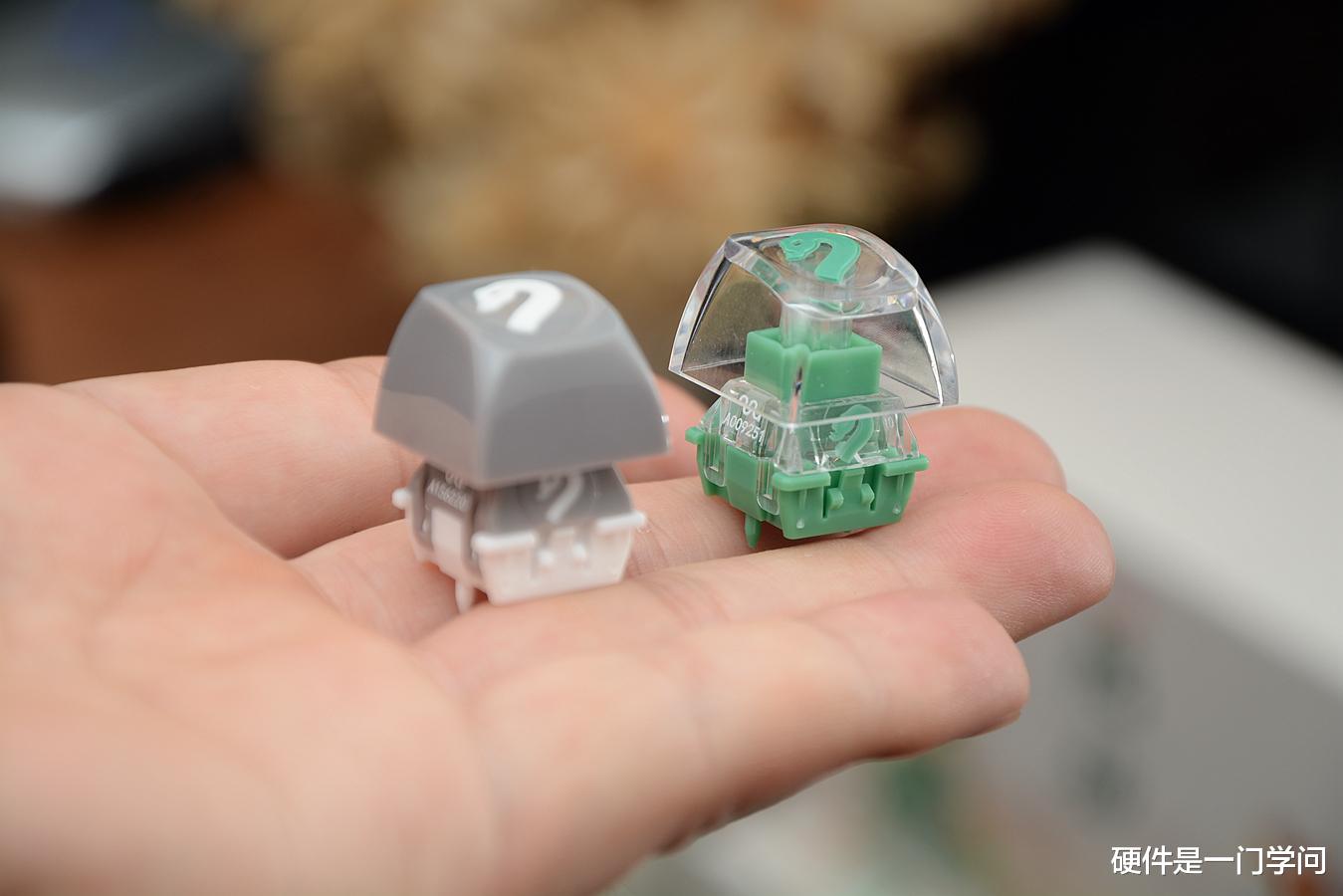 透光方面,由于轴体配备了聚光功能的导光柱,灯光会更聚集一些,适合搭配正刻或侧刻键帽。