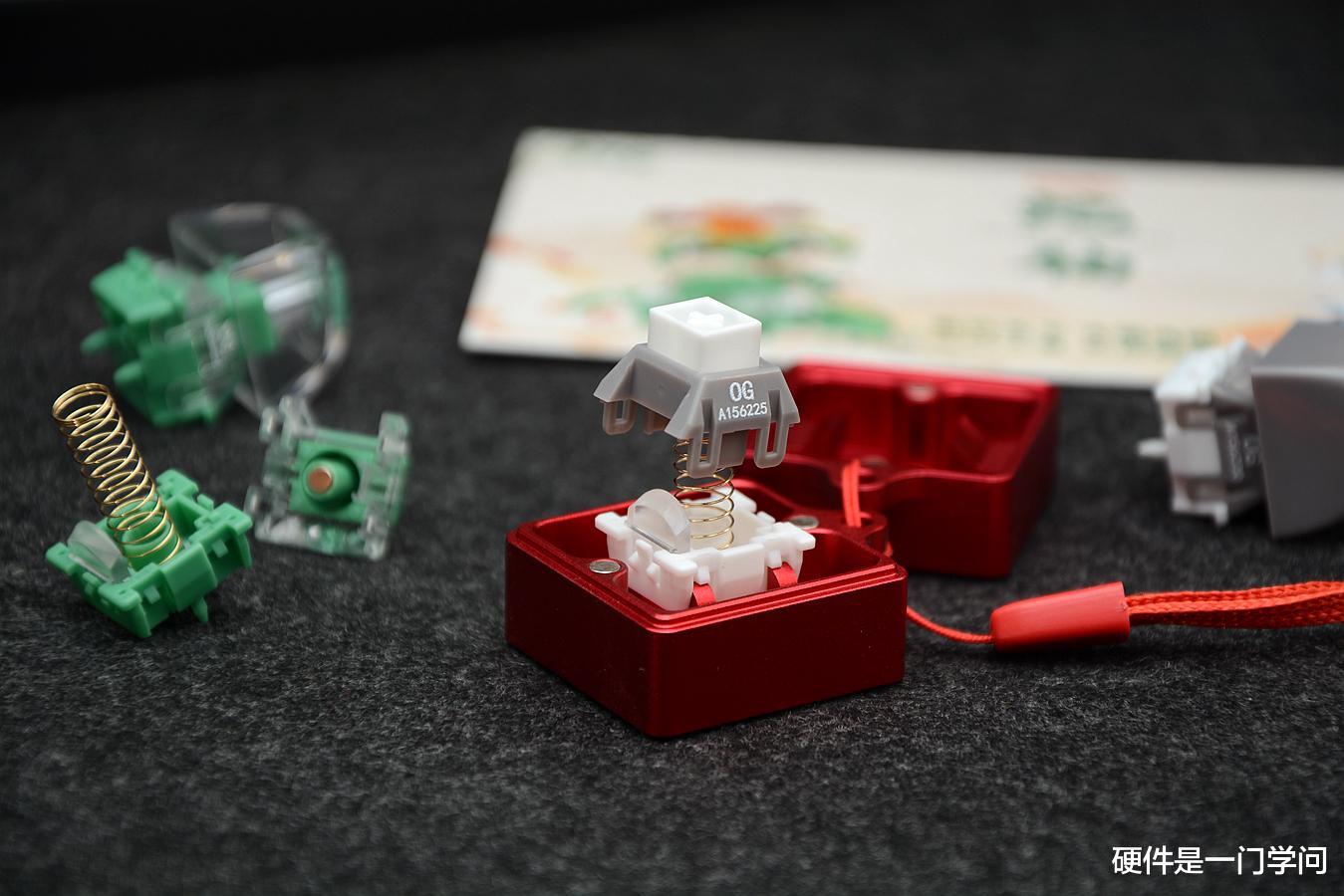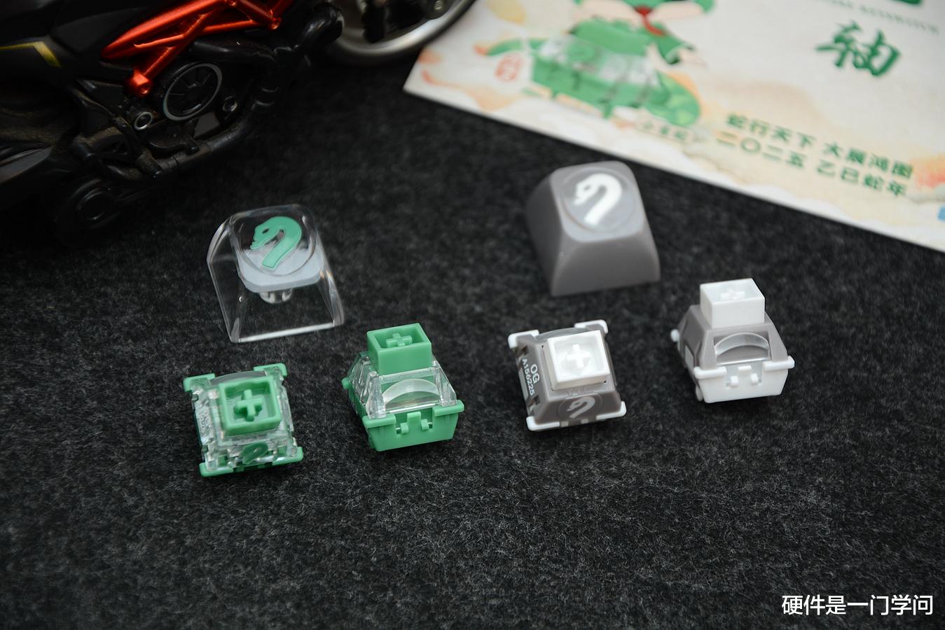 上盖印有专属OG编码,正面为独立成型的生肖蛇型图案。轴体配有独立导光柱,导光和聚光的作用,为了适配各种键帽,顶部进行了斜切处理。内部弹簧进行了镀金处理,延长使用寿命,弹簧低端涂有润滑脂,降低噪音,提升手感。