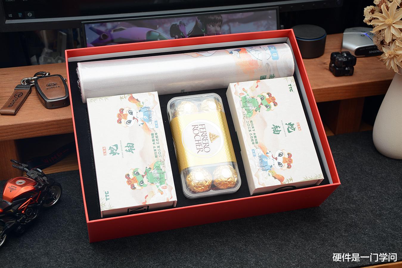 礼盒包含小青蛇万磁王轴一盒、白蛇万磁王轴一盒、乙巳生肖蛇鼠标垫一张以及16粒装费列罗巧克力一盒。