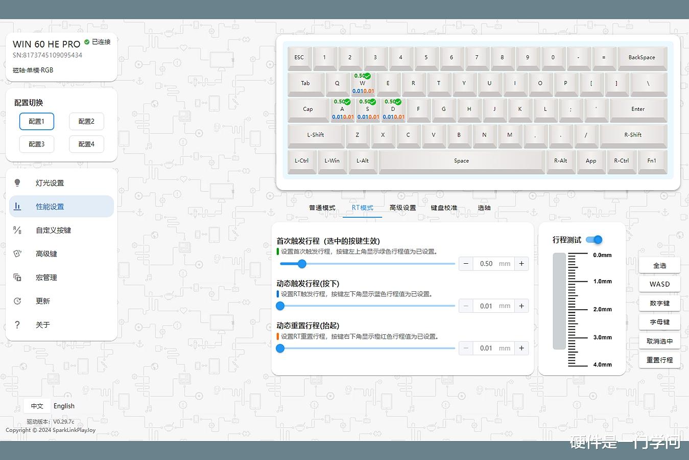 对于磁轴键盘用户,我建议设置两套配置,一套采用默认设置用来办公打字,一套将WASD键进行RT模式设置,用来玩瓦。选轴设置,目前驱动里有万磁王轴,数据接近,可以暂时选择这个,希望键盘厂家后期加上生肖蛇轴。