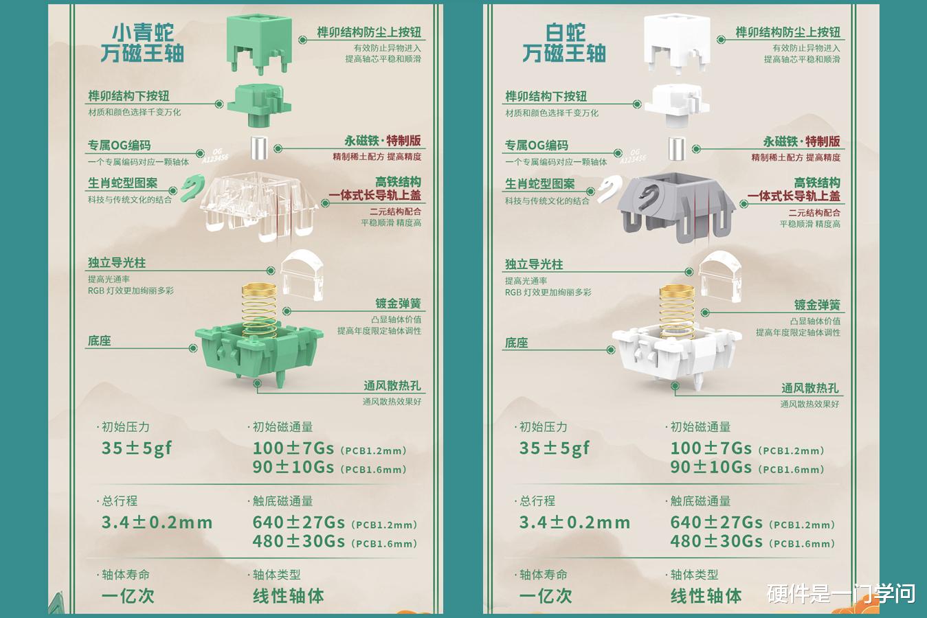 虽然TTC两款生肖蛇轴都带有万磁王名称,但与TTC万磁王轴还是有所不同的,抛开生肖元素,结构上采用了一体高铁式长轨道,材质上用料更厚实,永磁铁采用新配方,初始磁通量精准度提升33%以上,触底磁通量精确度提升50%,整体性能更好。TTC万磁王的导光柱是与上盖一体的,而生肖蛇轴采用独立的导光柱,具有更好的导光、聚光效果。另外,生肖蛇轴的弹簧进行了镀金处理,提升使用寿命。