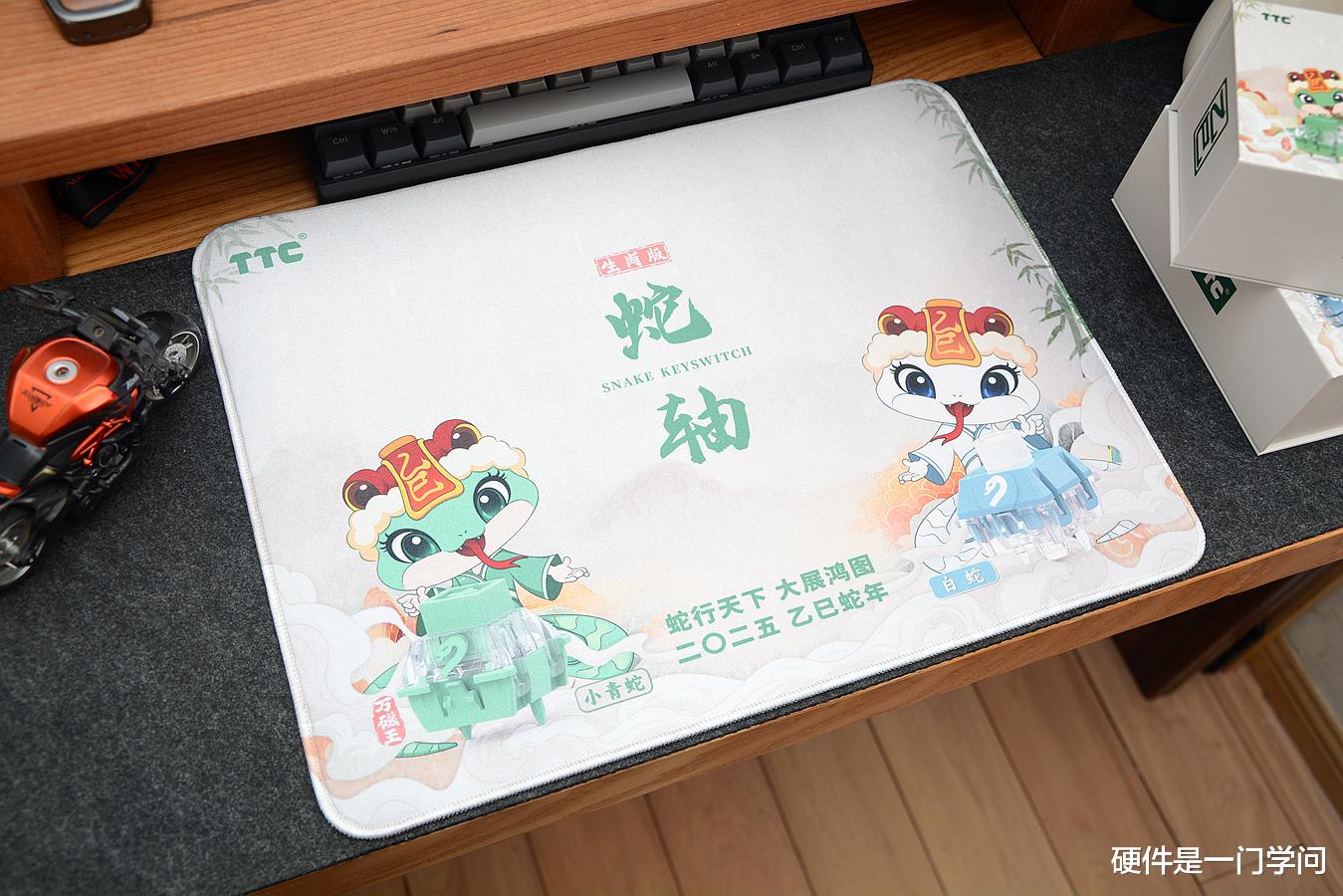 TTC乙巳生肖蛇鼠标垫为中大号尺寸,环保天然橡胶+精丝面料,边缘锁边处理,底部带有防滑纹理。除了可以当鼠标垫外,还可以当做87、75、68、61等中小配列键盘的桌垫使用。