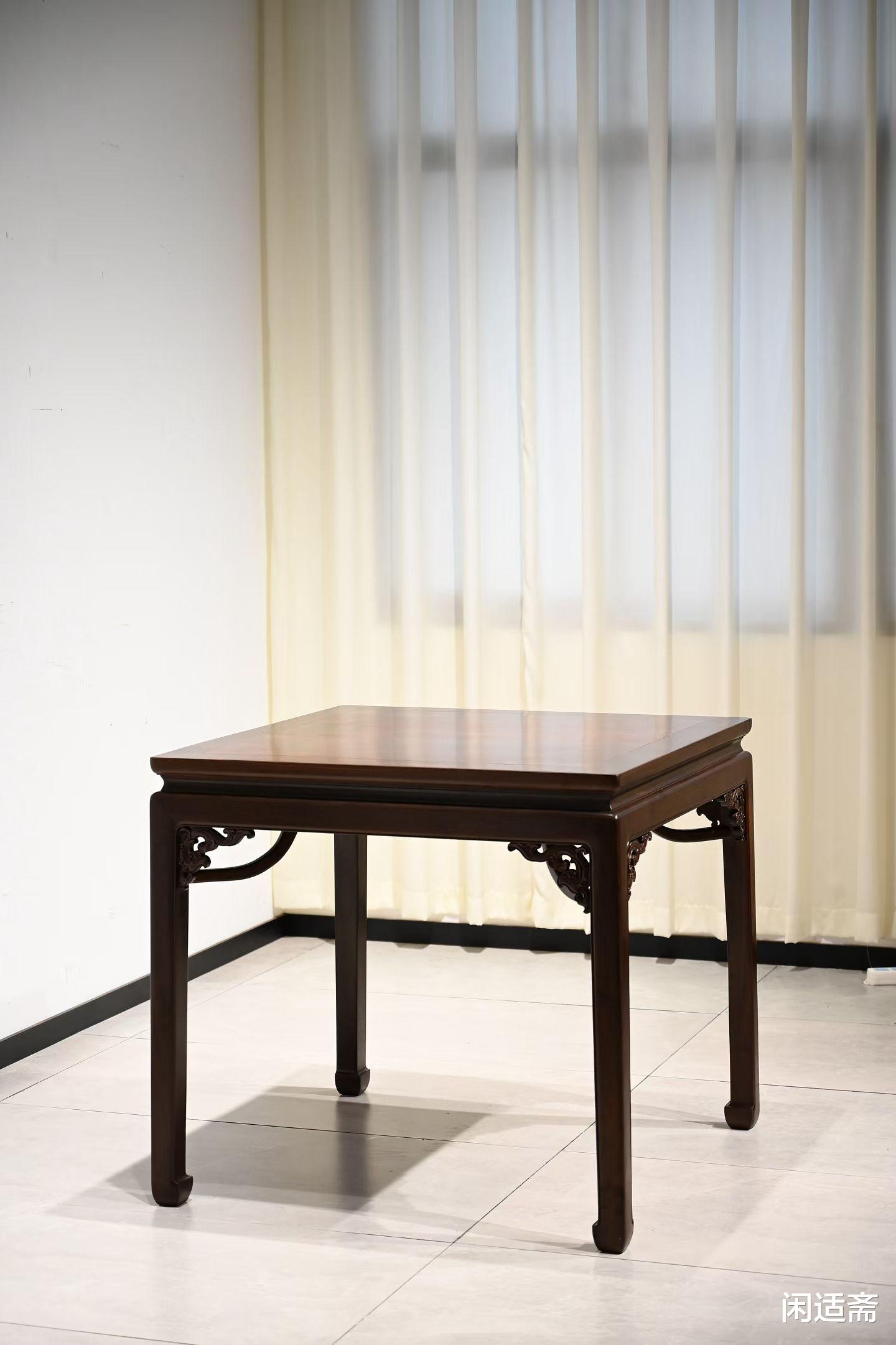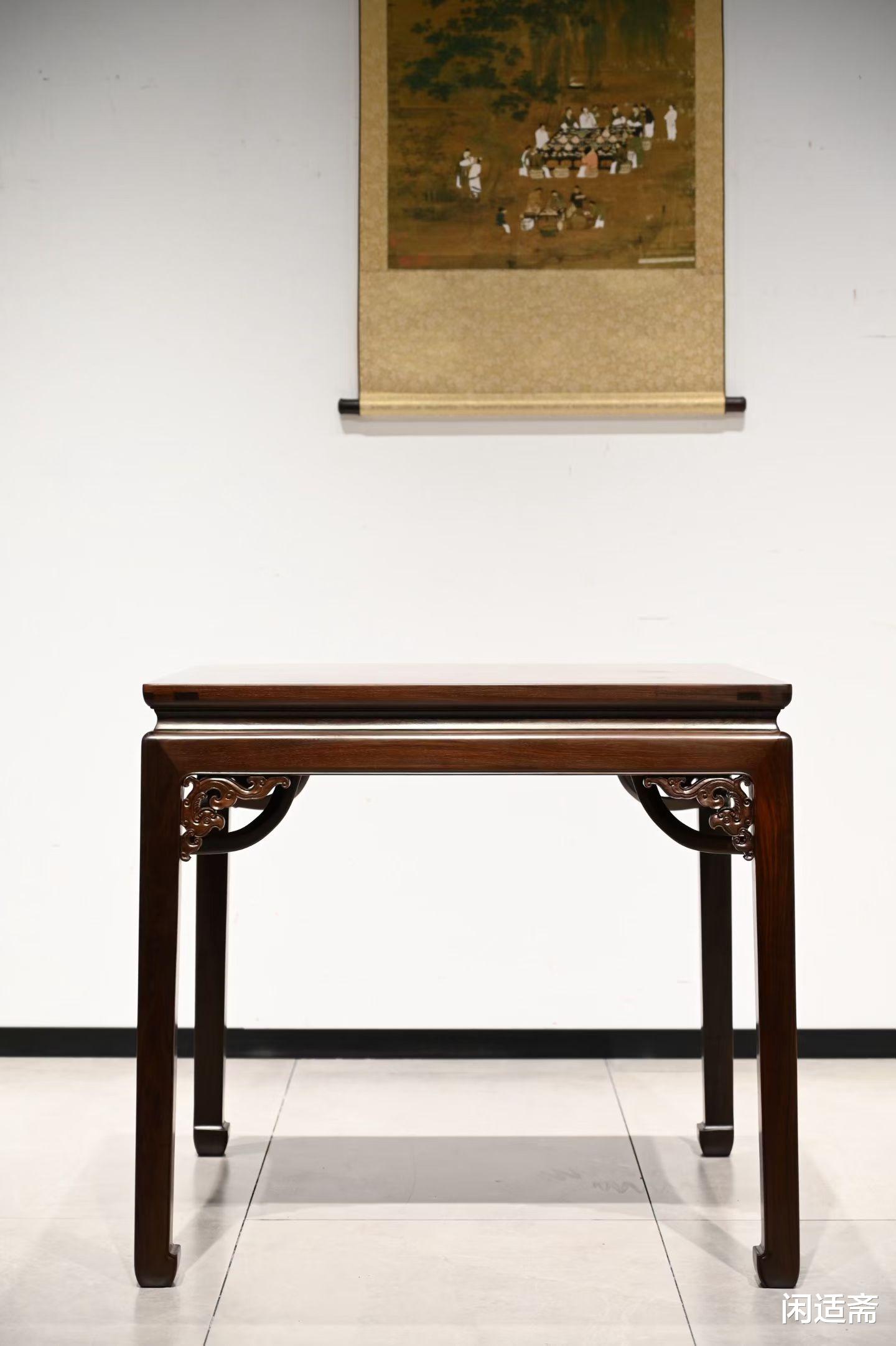 此件四方桌甄选优质大红酸枝精制而成,木色深沉醇厚,肌理致密细腻,纹理清晰流畅,自带独特的木质光泽,触感温润顺滑,质地坚韧耐磨,兼具耐用性与传世性。整桌形制规整,采用古法全榫卯工艺,工艺精湛,集螭凤纹牙角、霸王枨、高束腰、马蹄足四大经典明式元素于一体,形神兼备、雅韵十足。