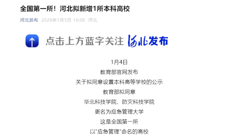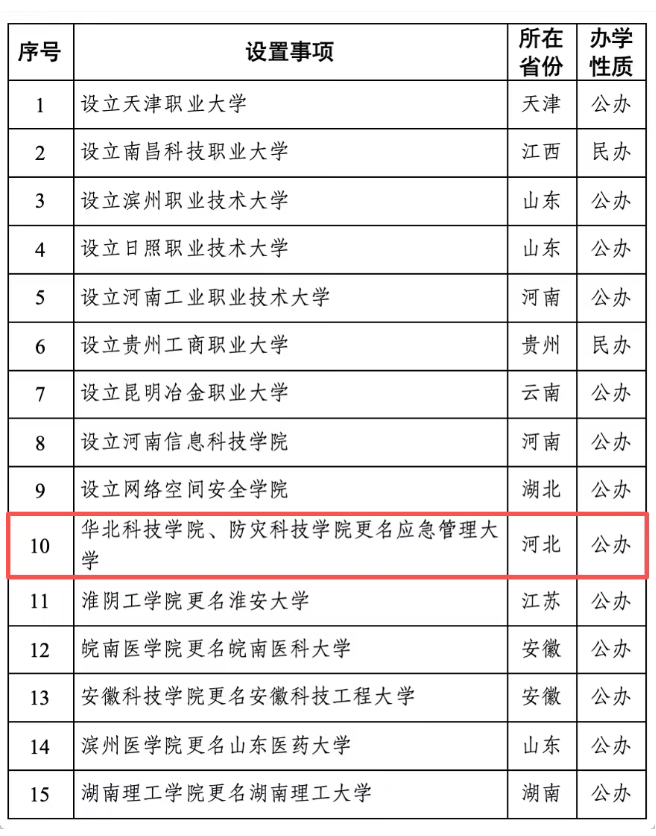 1月4日,教育部发布关于拟同意设置本科高等学校的公示。其中涉及了十六所学校,其中华北科技学院、防灾科技学院两所学校合并,共同组建应急管理大学!