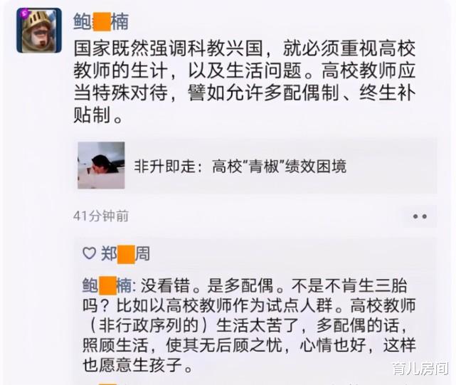 这个人在自己的朋友圈里表示,既然我们现在要发展科学技术,那就要把高校学者的福利给搞上去,可以允许男性学者有多个配偶,让他们的优良基因传递下去。