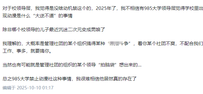 甚至有网友如此评论:未来高考的大学生们,建议你们在报考一所大学之前,尤其是一个理工类为主、计算机很牛的大学之前,建议先看看这个学校有没有动漫社,如果没有,那就快跑,因为大概率在这里不会有一个满意快乐的四年。