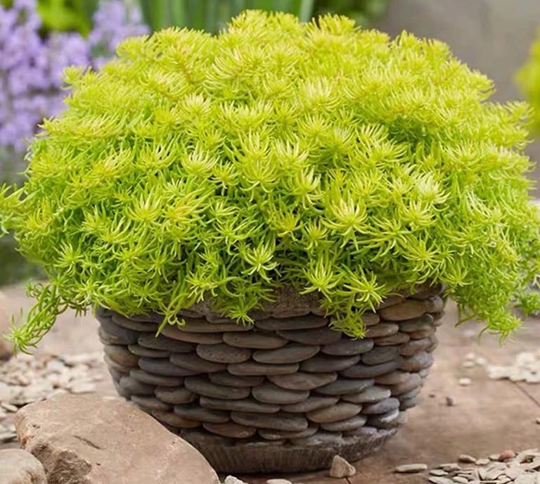 对比一下其他的绿植品种。有一种叫垂盆草的植物,它和佛甲草有些相似之处,也是多肉植物,而且耐旱性也不错。但是垂盆草的生长速度比佛甲草要快一些,在南方的一些家庭阳台上,垂盆草如果养护得好,一个月就能长满一个小花盆。而佛甲草相对来说生长速度较慢,在同样的环境下,可能需要两三个月才能达到差不多的覆盖效果。还有一种冷门的绿植叫瓦松,它也是适合在一些特殊环境下生长的植物。瓦松对土壤的要求比佛甲草要高一点,它更喜欢偏酸性的土壤,在华北的一些山区,瓦松生长得比较好,但是在文创园区这种人工环境下,就比较难种植。