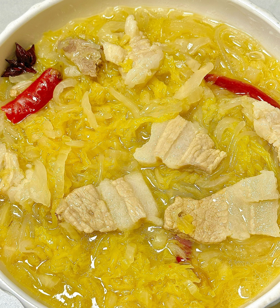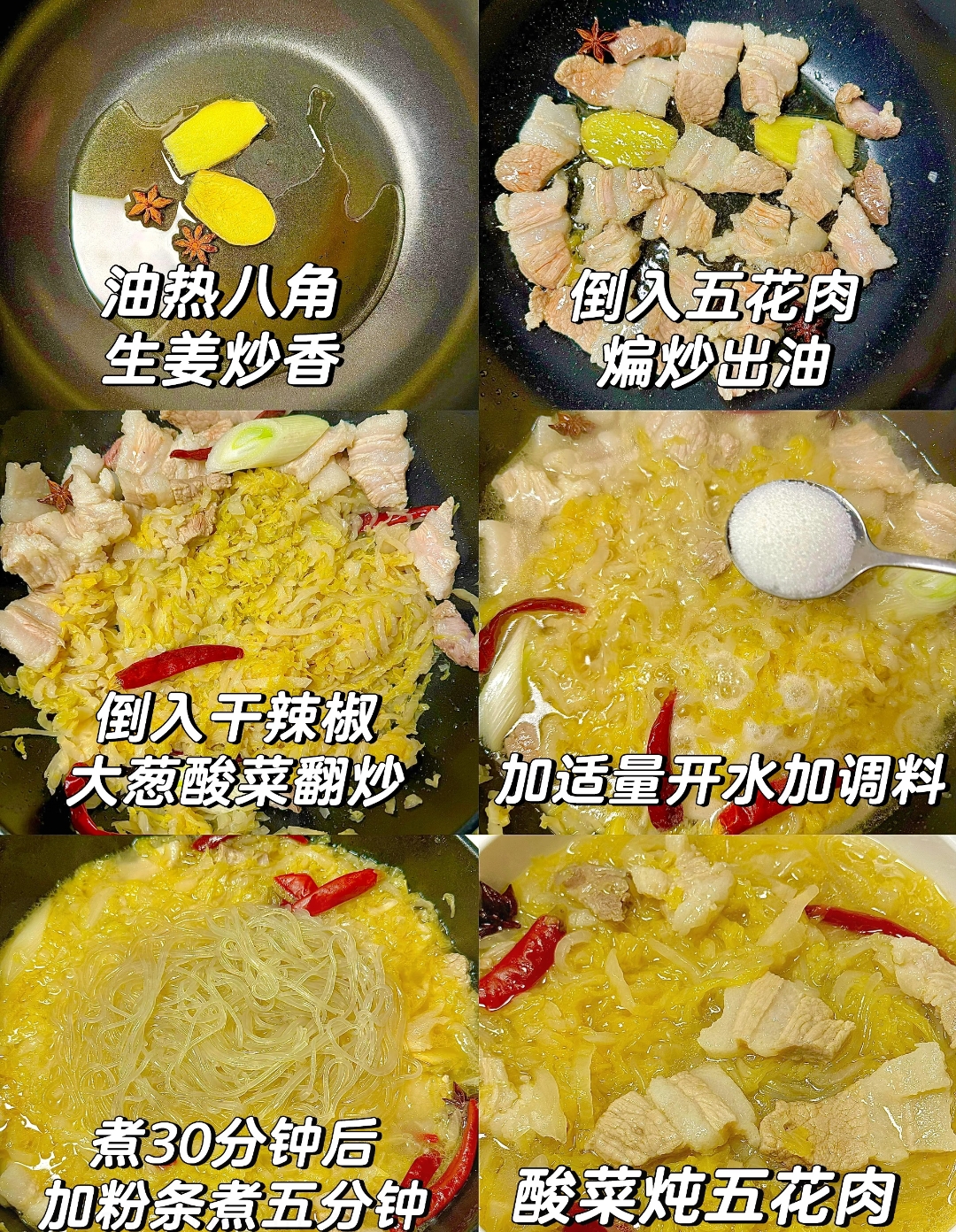 香气炒出后,便进入了炖煮环节。向锅中加入足量的开水,水量需没过所有食材,切记使用开水能让肉质更加软烂入味。随后进行调味,加入两勺盐、一勺鸡精和一勺胡椒粉,调味时宜少量多次,根据食材的多少灵活调整,以免过咸。大火煮沸后,盖上锅盖转中小火慢炖三十分钟。时间的沉淀让酸菜吸足了肉香,五花肉也变得软糯可口。最后,放入提前泡软的粉条,继续炖煮五分钟,粉条极其吸水,会迅速吸饱浓郁的汤汁,变得晶莹剔透、Q弹滑溜,一道色香味俱全的酸菜五花肉炖粉条便大功告成了。