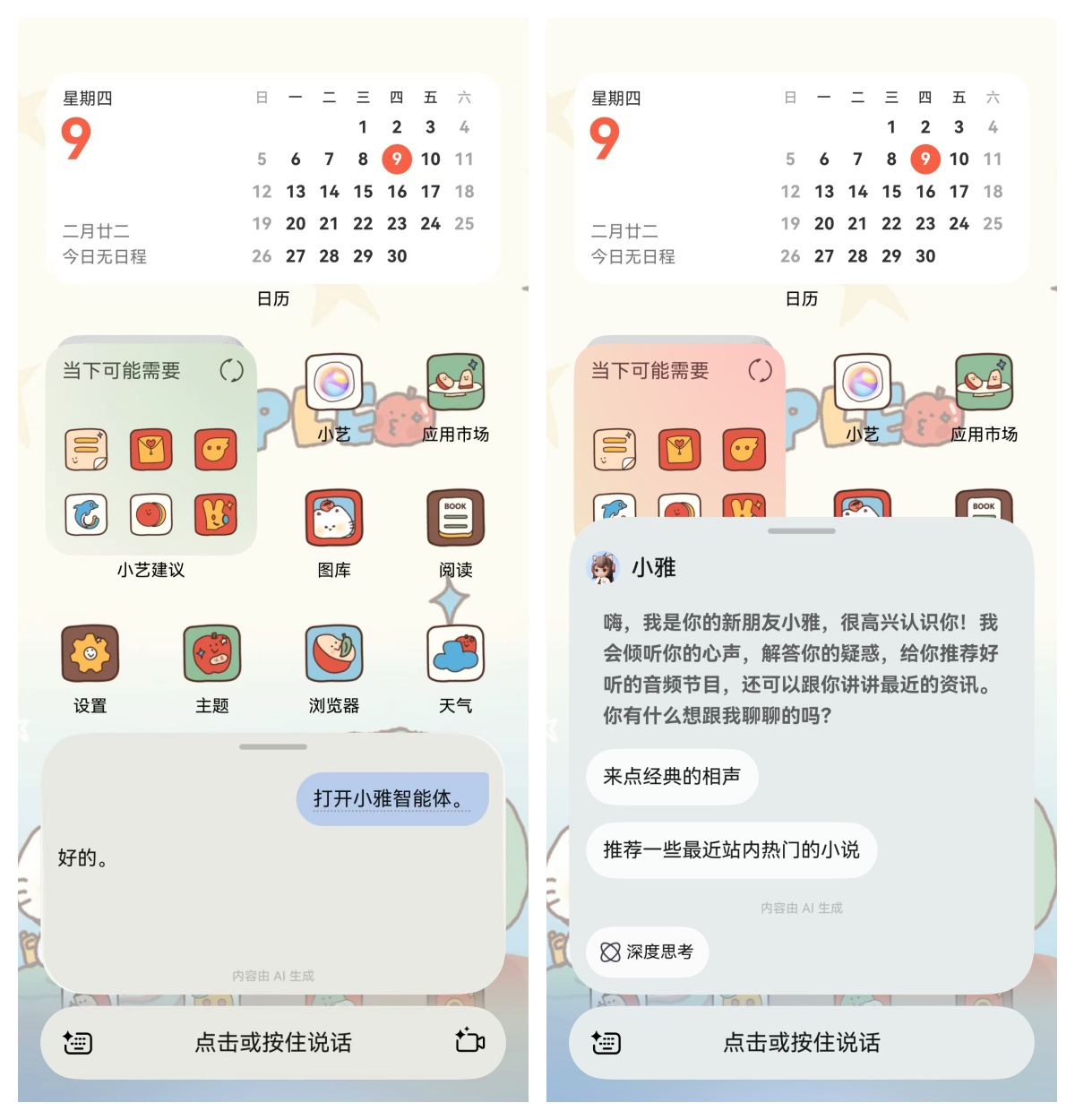 但在鸿蒙6上,操作逻辑有些不同,直接通过系统交互唤醒:双击电源键或长按底部导航条叫出小艺,说“打开喜马拉雅智能体”或“打开小雅智能体”即可,也可以进入小艺智能体广场、搜“小雅”使用。