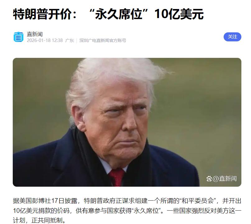 他搞的这个“和平委员会”,更是离谱——明着要10亿美元才能换永久席位,自己还攥着一票否决权,不顺心就拿关税威胁别人,把霸道不讲理的那套玩到了头。