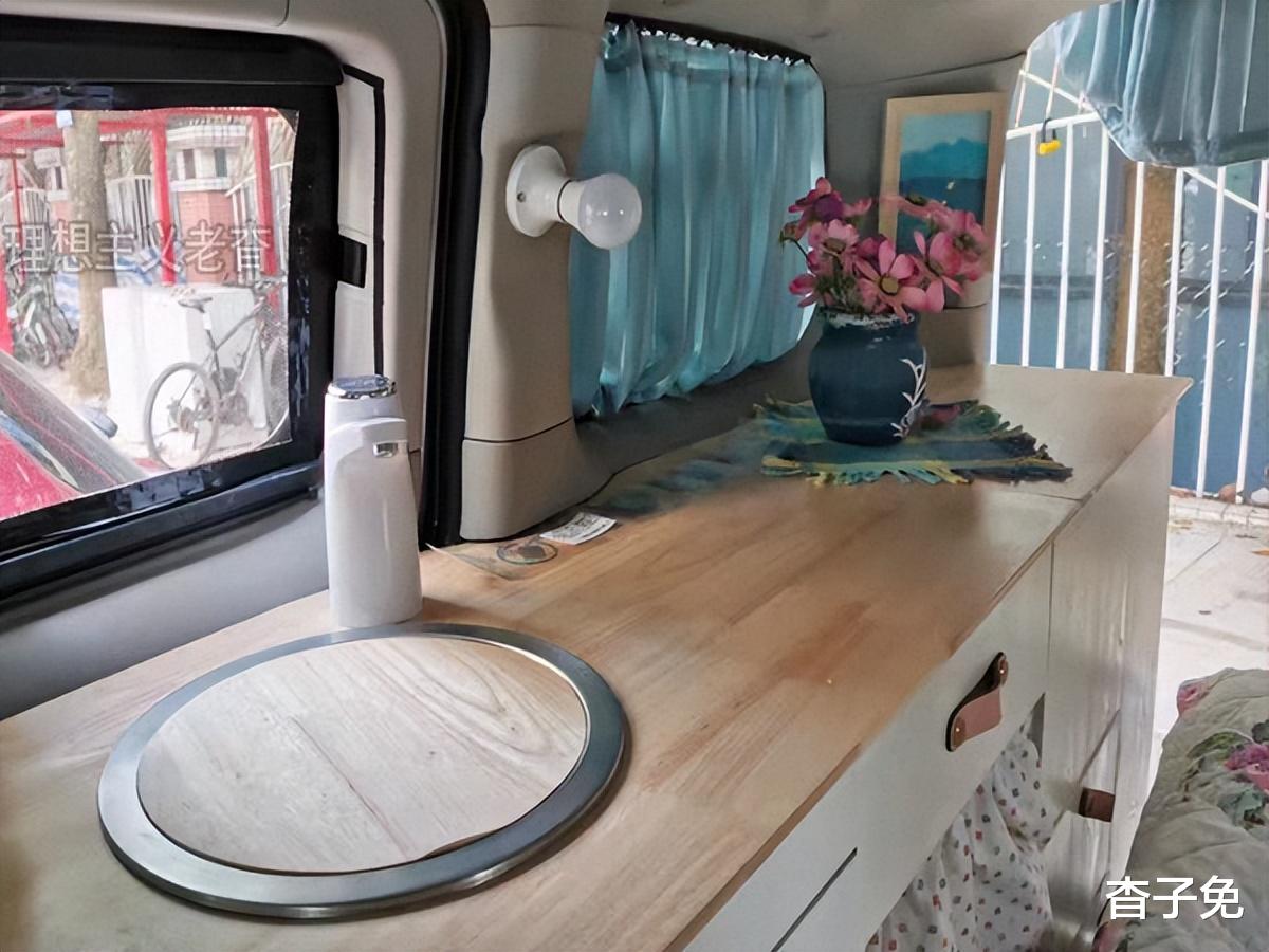 车内右侧是微厨区,下面有水有电有炊具,上面有洗菜池,旅途中在车内做饭很方便。