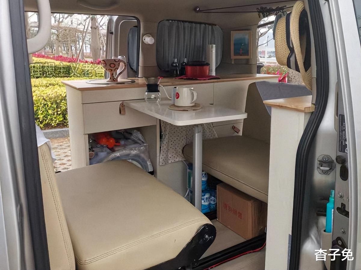打开中门,车内中后排座椅换成了床车专用椅,中排座椅已向后翻转,与后排形成对座,中间添置了一张简易折叠桌,组成车载小客厅,是日常喝茶吃饭与学习办公的地方。