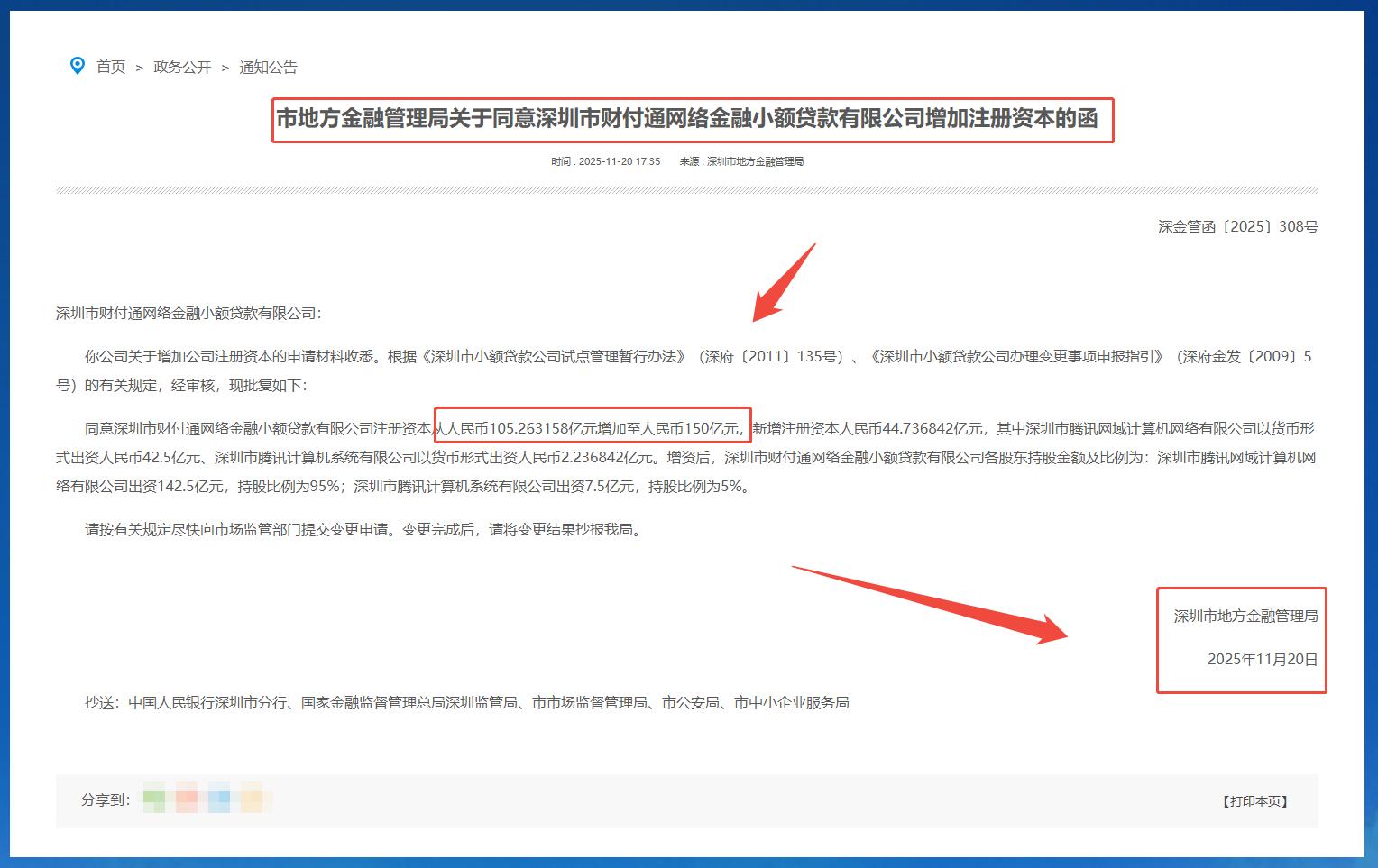 今日(11.20),深圳市地方金融管理局发布公告,同意深圳市财付通网络金融小额贷款有限公司(以下简称“财付通小贷”)完成新一轮增资。注册资本由105.26亿元增加至150亿元,增幅达42.5%。此次增资由腾讯系两家公司全额认缴,增资后股权结构保持不变。