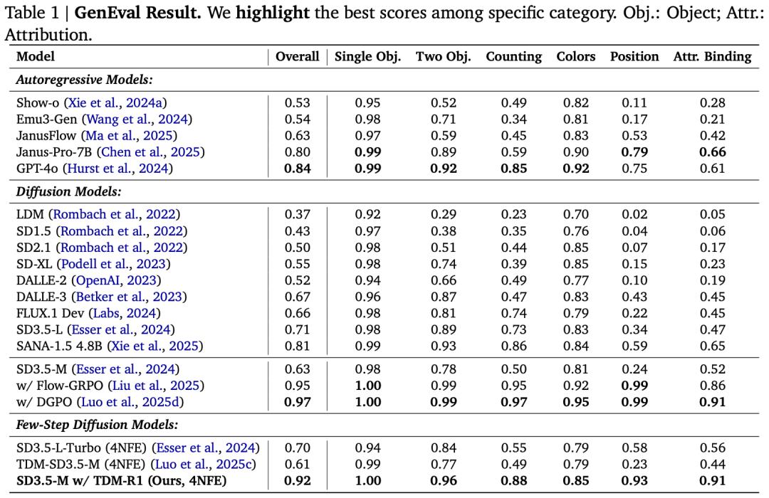 对比组 2(GPT-4o):GenEval 为 84%,同样被 TDM-R1 超越,凸显模型核心优势。