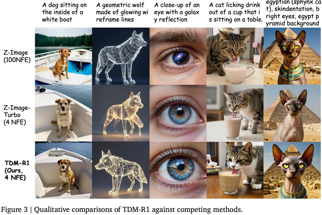 TDM-R1 并非 “针对特定模型的技巧性优化”,而是一套通用的强化学习范式,可轻松扩展至更强的开源大模型。研究团队将其应用于近期热门的 6B 参数 Z-Image 模型,以 HPSv3(一款优质奖励模型,能有效避免 “奖励黑客” 现象,提升生成图像实际质量)作为奖励信号进行对齐,实验结果同样亮眼: