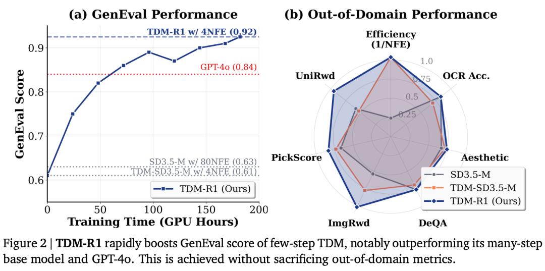 超快速 AI 生图领域再破性能天花板!香港科技大学唐靖团队、香港科技大学(深圳分校)胡天阳、小红书 hi-lab 罗维俭提出全新通用强化学习框架 TDM-R1,精准破解超快速扩散生成的核心痛点 —— 仅需 4 步采样(4 NFE),便将组合式生成指标 GenEval 从 61% 飙升至 92%,不仅碾压 80 步基础模型的 63%,更直接超越 GPT-4o 的 84%,让快节奏生图不仅实现 “高效低成本”,更能 “精准听懂指令、贴合真实需求”。