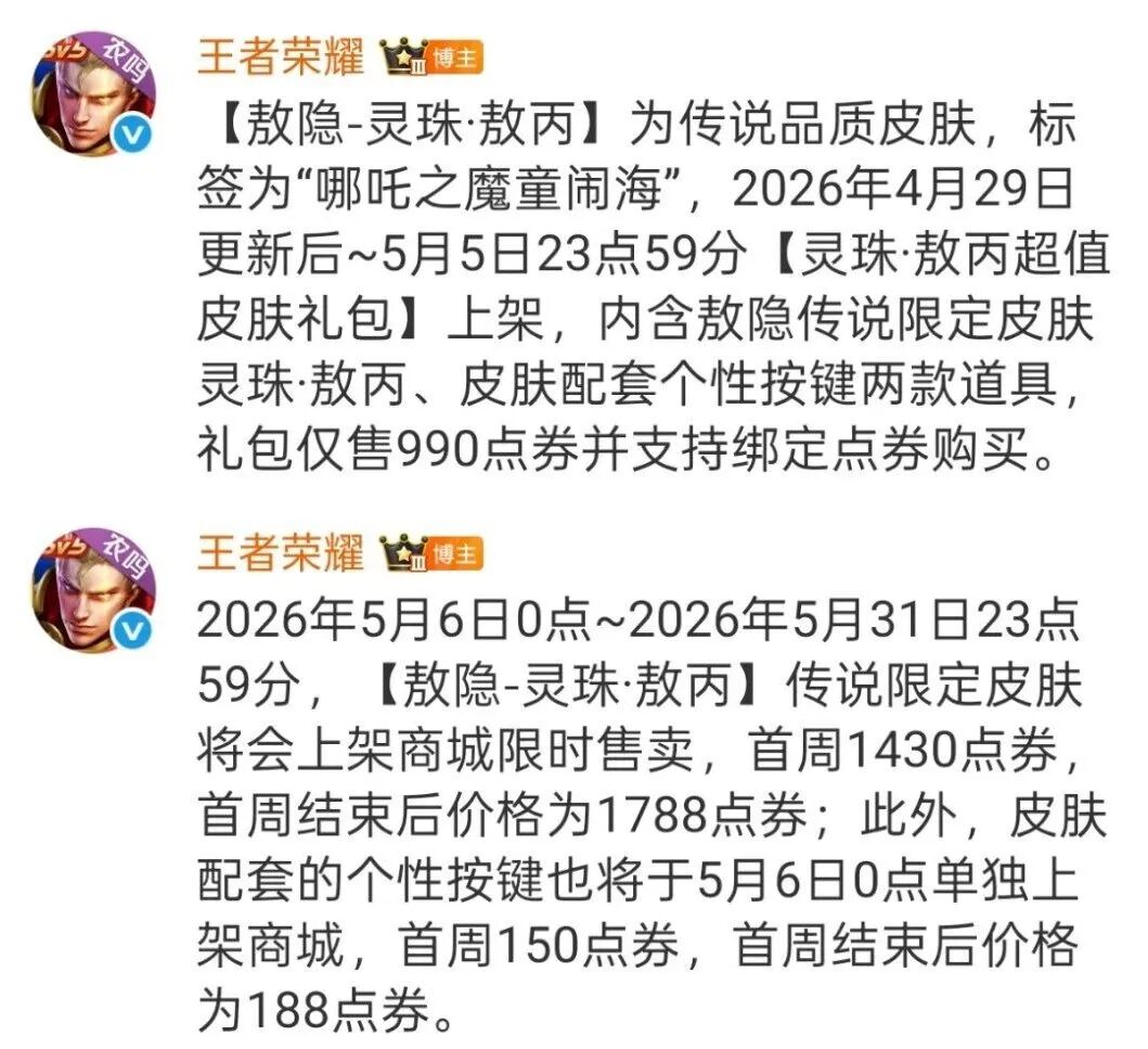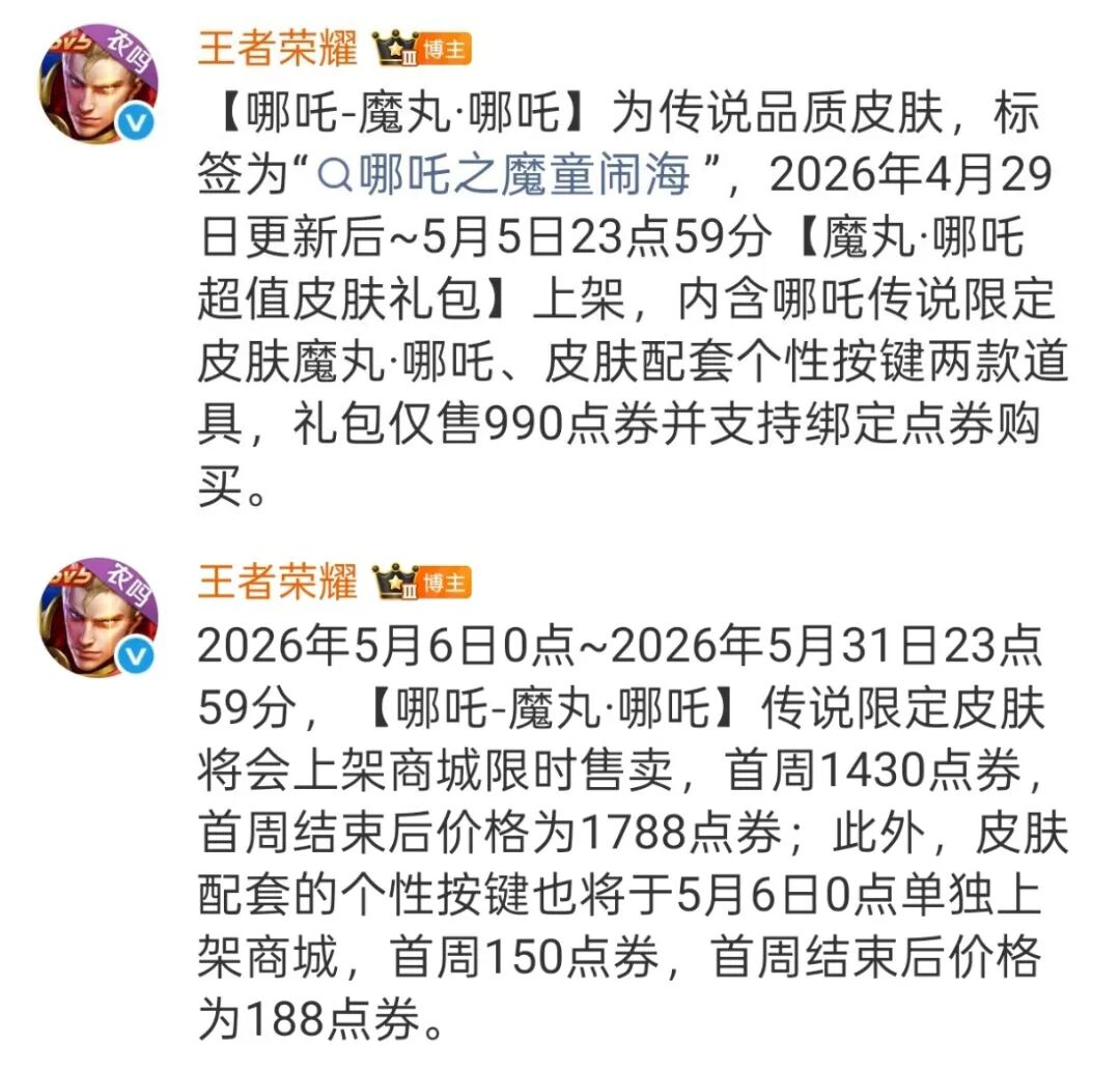 哪吒的这款联动皮肤【魔丸·哪吒】是传说品质,4月29日超前上线,有皮肤和个性按键的打包,是990点券。5月6日是正式上线,首周是1430点券,个性按键也开始被拆分出来了。