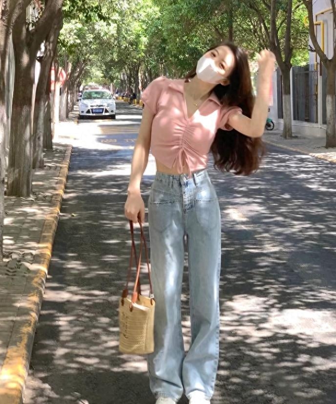 不管是打工人,还是出门逛街,这一套穿搭都很合适,浅粉色短款t,真的是今年夏天流行款,最适合小个子身材穿了,搭配高腰牛仔阔腿裤来配,运用起“上短下长”的穿衣方式,不仅优化了身材比例,还显瘦显腿长。