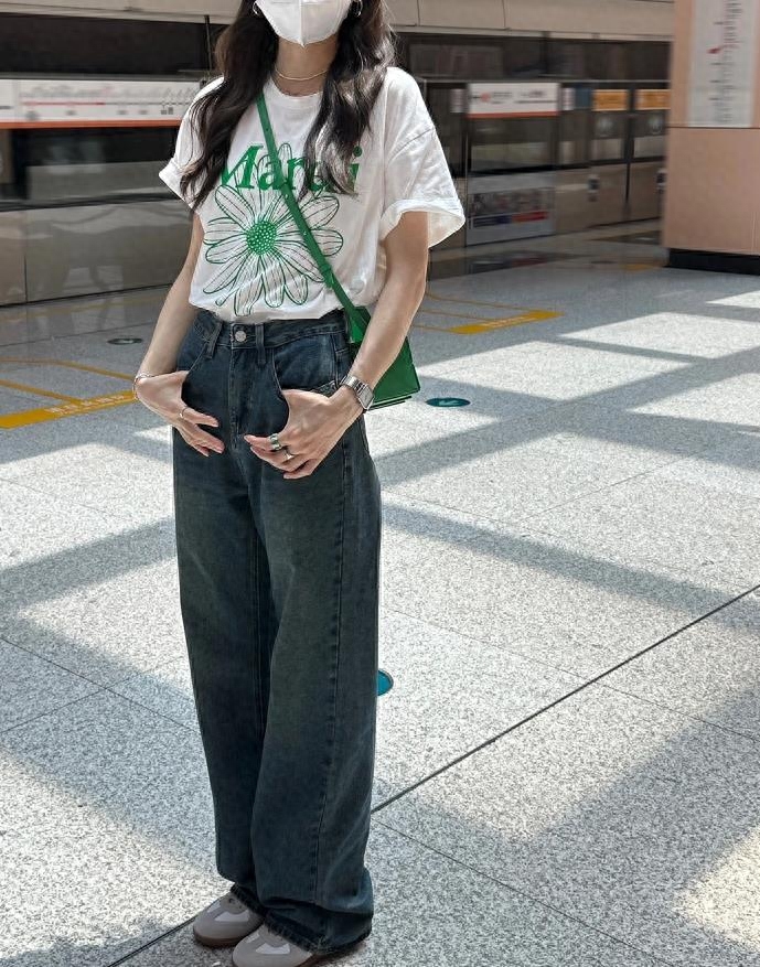 简单配一件白色短袖t恤,胸前绿色印花图案点缀,超吸睛洋气,记得要把t恤的下摆全部塞进裤子里面,提高腰线比例,又延长腿部线条,绝了!▼