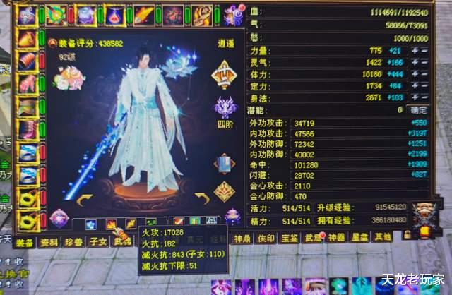 今天给大家介绍的,是一位43万评分的92卡级逍遥,先看面板:血量119万,蓝量7.3万,命中10万,闪避2.8万,会心攻击2110,会心防御470。