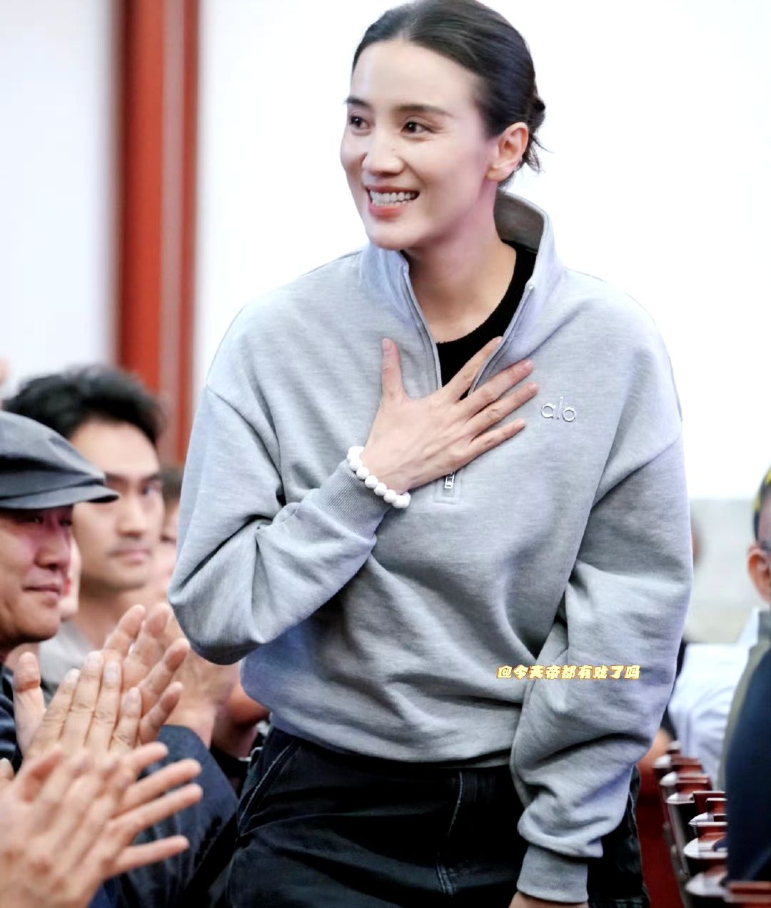 当天她选择了一件极简的灰色卫衣,搭配休闲裤,发型依旧是最适合她的中分低丸子头。