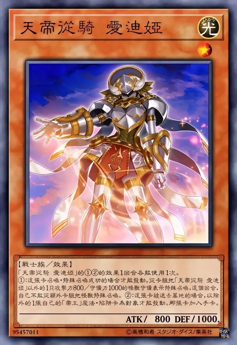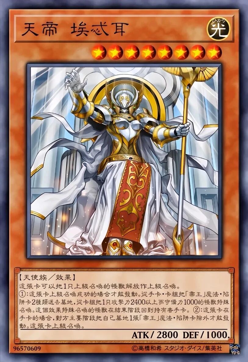 效果破坏自己的卡也能触发抽卡,因此常用来破坏自家的帝王的开岩、真帝王领域等永续魔法/场地来快速抽牌。配合帝王的轰毅(对方怪兽效果发动时,解放自己场上1只上级召唤的怪兽使其无效),可连锁光帝效果进行抽卡+无效的组合。在《游戏王ARC-V》中由泽渡真吾使用,常用于破坏自己的场地来抽卡加速。随着系列发展,出现了更强力的8星“帝”,它们通常只需解放1只上级召唤的怪兽即可出场,并在解放特定属性怪兽时获得追加效果。冻冰帝 美比乌斯-破坏最多3张魔法·陷阱卡;解放水属性时对手不能连锁刚地帝 格兰玛格-破坏最多2张盖卡;解放地属性时抽1张卡爆炎帝 泰斯塔罗斯-丢弃对方手牌并给予伤害;解放炎属性时追加破坏场上的卡