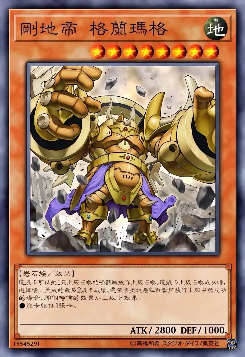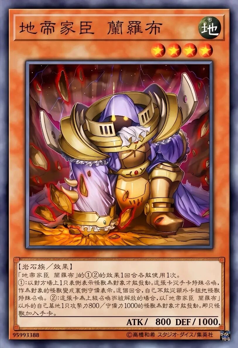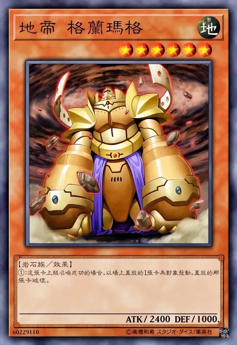 高等召唤成功的场合,必定以场上的1张盖放的卡为对象发动。将盖放的那张卡破坏。专攻盖卡破坏,对付重坑卡组有奇效。配合地帝家臣 兰罗布(地属性·岩石族,可代替2只祭品进行上级召唤)能轻松出场并触发效果。在“刚地帝”形态下,解放地属性怪兽可既清后场又抽牌,