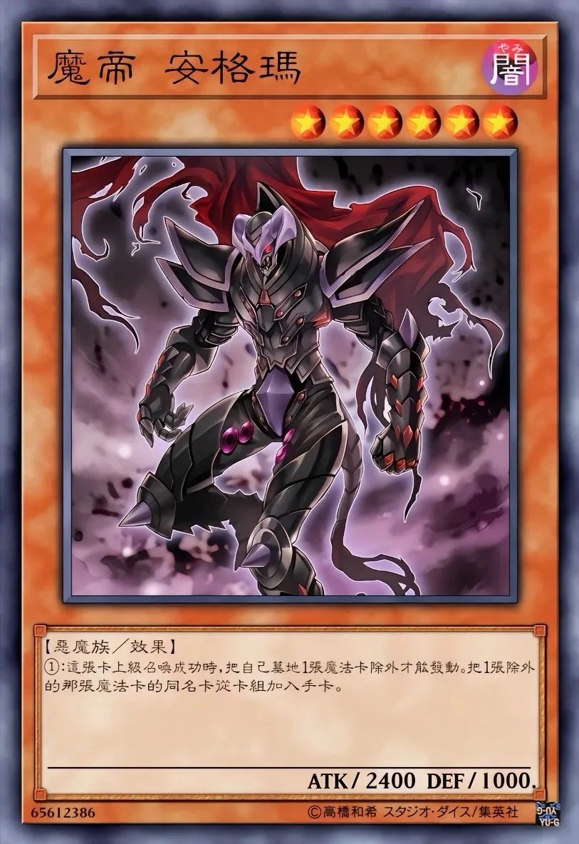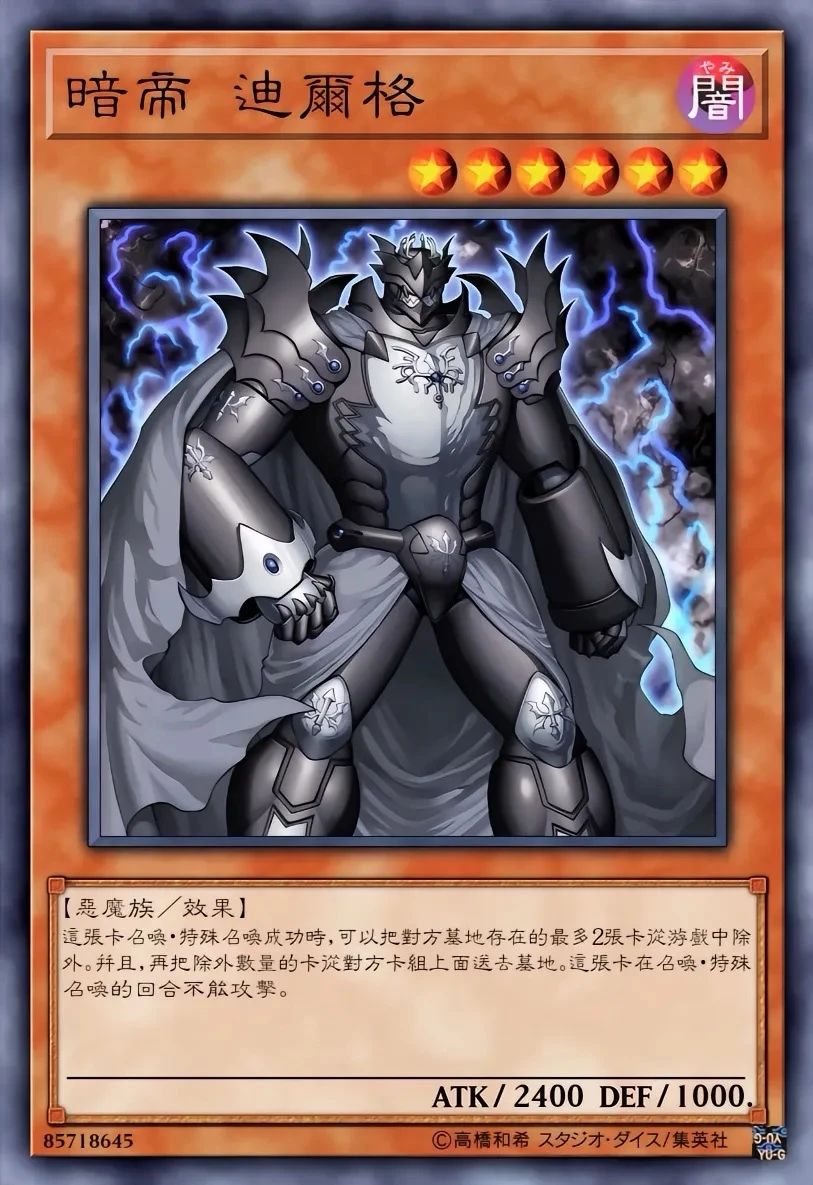 除外效果非常灵活,能处理任何表侧/里侧的卡。配合帝王的深怨(丢弃手牌“帝王”魔法·陷阱检索本家卡),可精准堆墓并调度资源。在暗属性多的卡组(如“青蛙”)中,容易触发追加伤害。在《游戏王ARC-V》中由泽渡真吾使用,多次通过除外关键卡扭转局面。