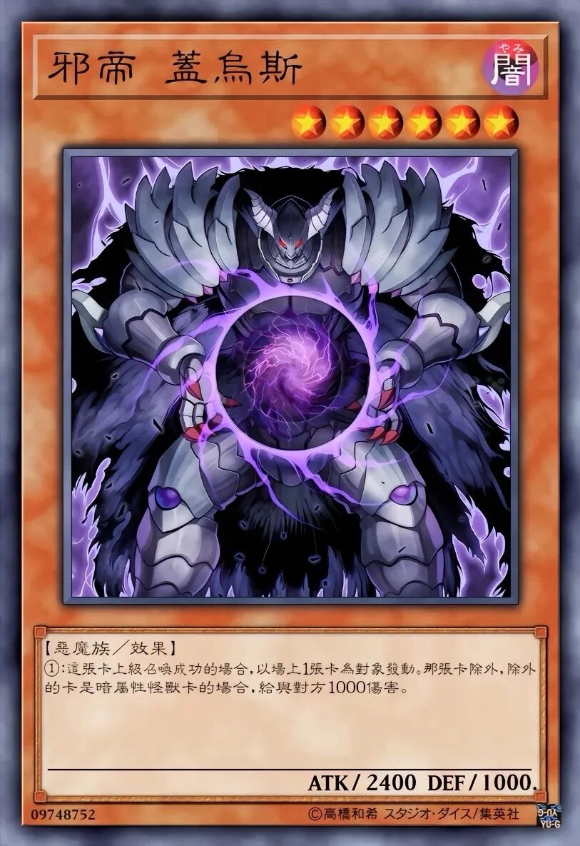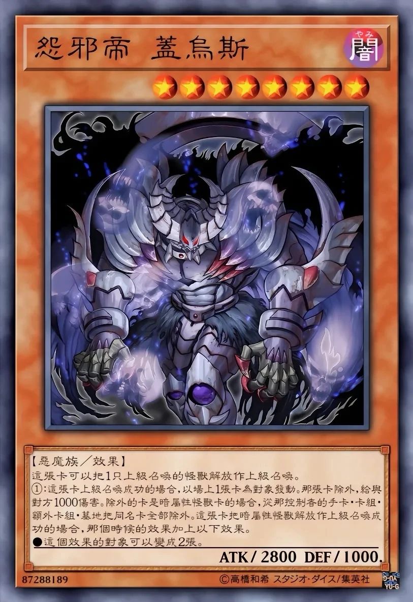 怨邪帝 盖乌斯-除外场上卡并给予伤害;解放暗属性时追加除外墓地卡天帝 埃忒耳-从卡组特召“帝”怪兽,结束阶段回手;解放光属性时追加抽牌