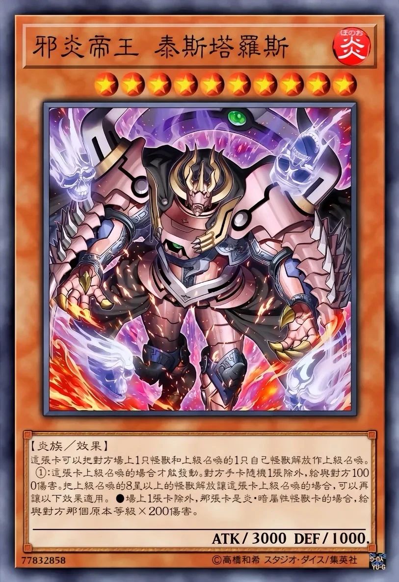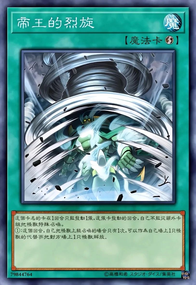 专攻后场清除。配合帝王的烈旋(将对方怪兽当作解放素材)可解掉对手关键魔陷。在真帝王领域下,解放对方怪兽召唤可触发破坏效果,同时规避自身祭品需求。
