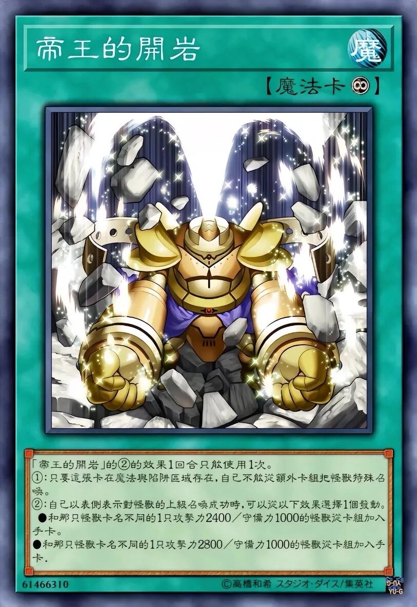 帝王的开岩:上级召唤成功时从卡组检索“帝王”魔法·陷阱,精准调度资源。