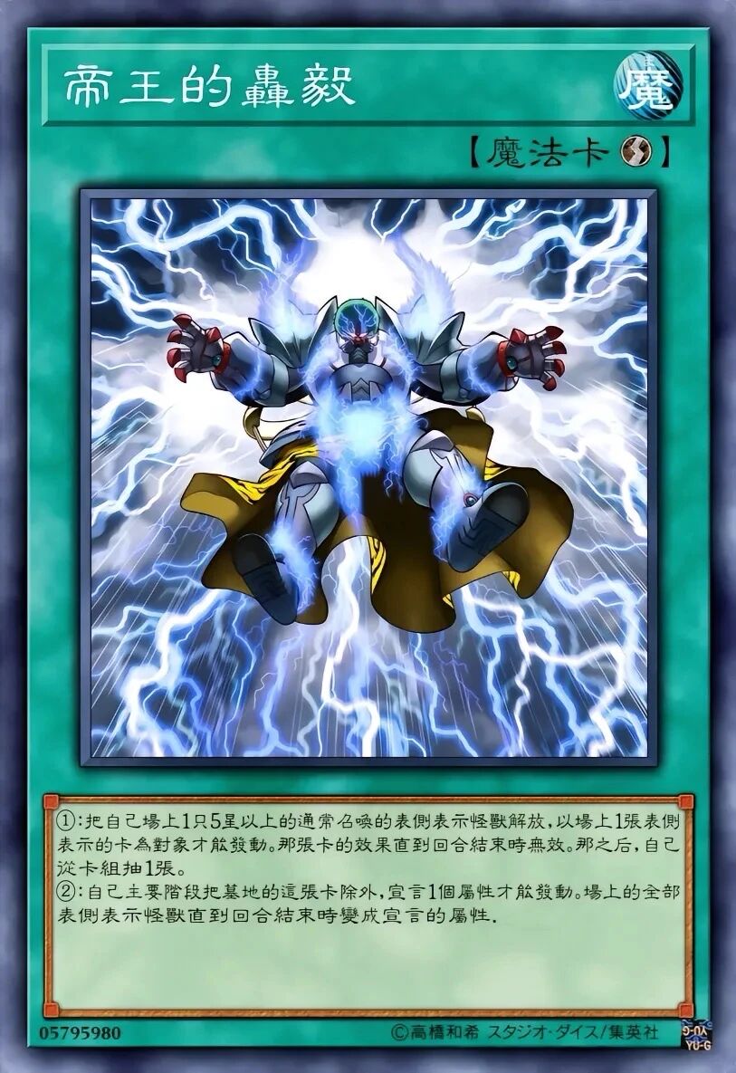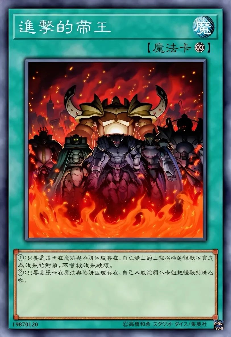 ②效果1回合只能使用1次。①:只要这张卡在魔法陷阱区存在,自己不能从额外卡组特殊召唤怪兽。②:自己以表侧表示高等召唤怪兽成功时,可以从以下的效果中选择1个发动。●从卡组将1只与那只怪兽卡名不同的攻击力2400/守备力1000的怪兽加入手牌。●从卡组将1只与那只怪兽卡名不同的攻击力2800/守备力1000的怪兽加入手牌。进击的帝王