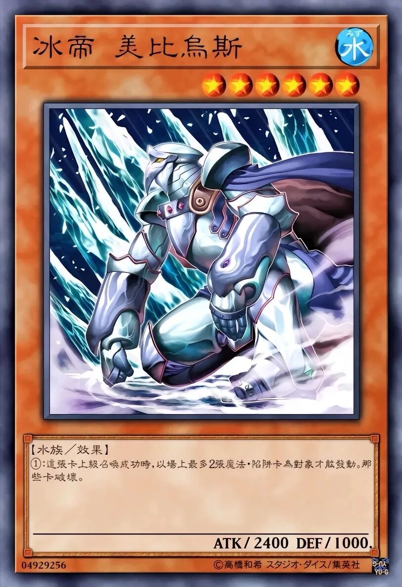 效果:这张卡高等召唤成功的场合,必定以场上的1只怪兽为对象发动。将那只怪兽破坏。冰帝 美比乌斯