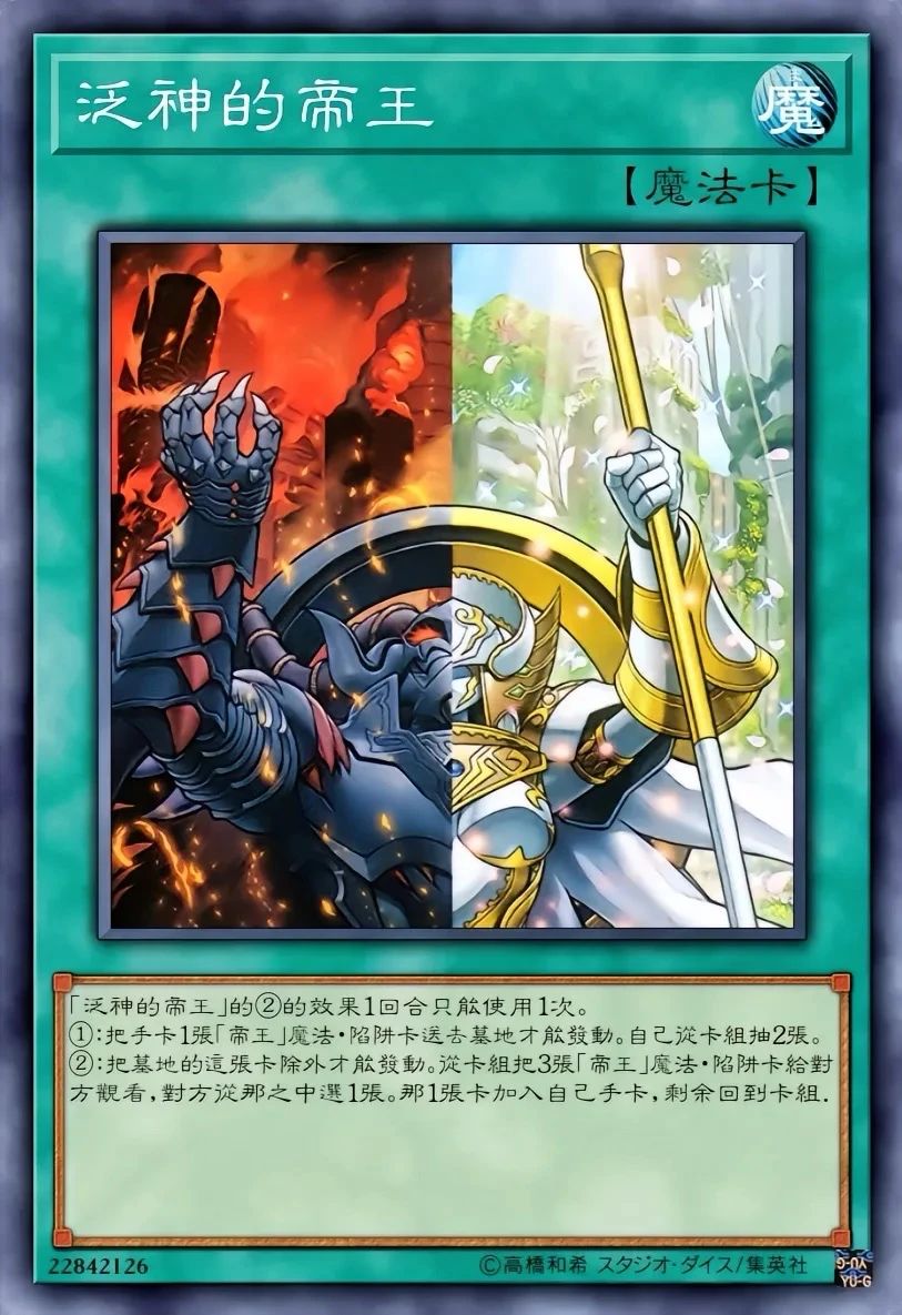 ①:只要这张卡在魔法陷阱区存在,自己场上的高等召唤的怪兽不会成为效果的对象,不会被效果破坏。②:只要这张卡在魔法陷阱区存在,自己不能从额外卡组特殊召唤怪兽。泛神的帝王