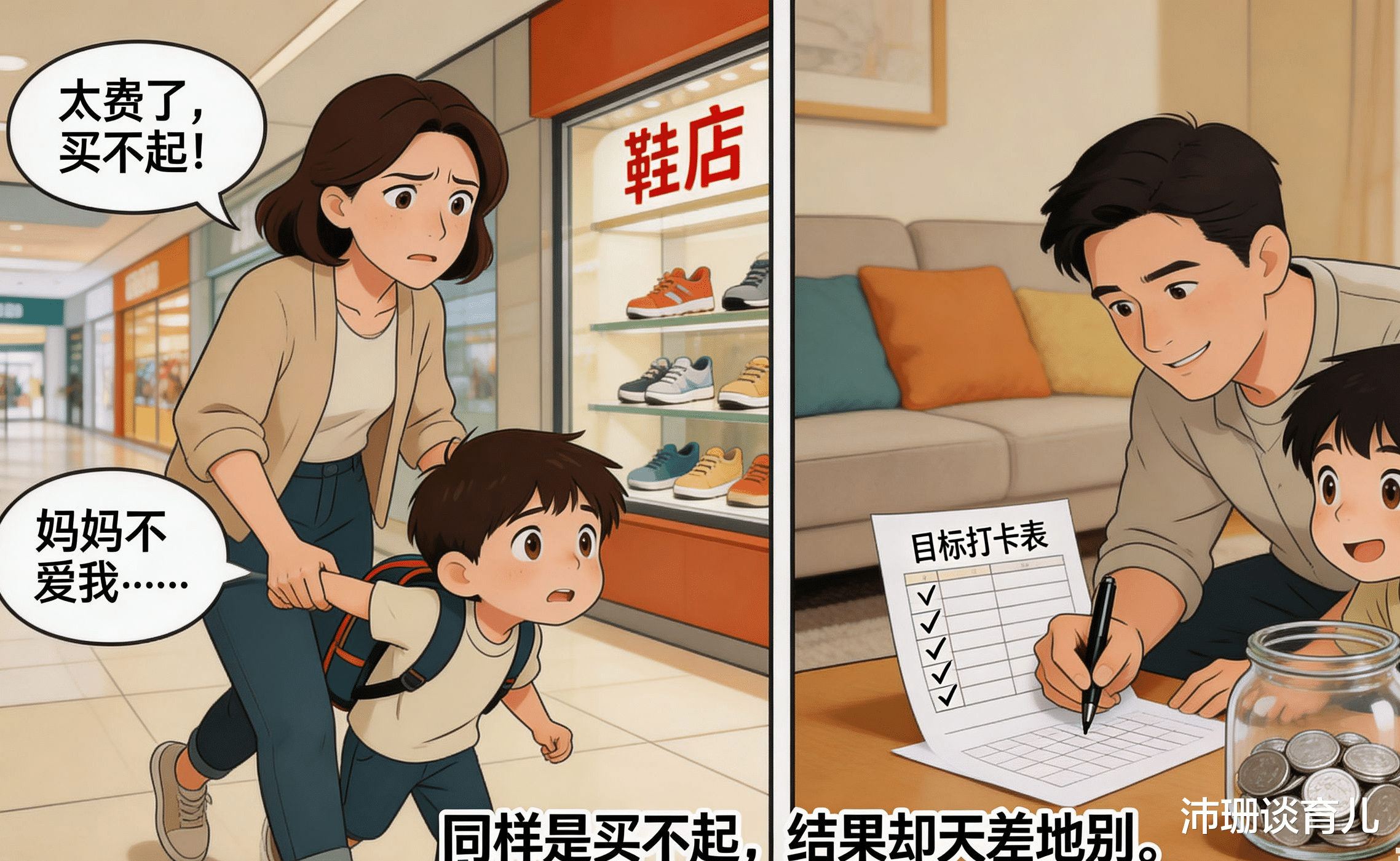 第二个爸爸,面对的是同一个冲突,但他把孩子拉进了“解决问题”的阵营里。他没说“买不起”——这三个字太伤人了,等于告诉孩子“咱家穷,你不配”。